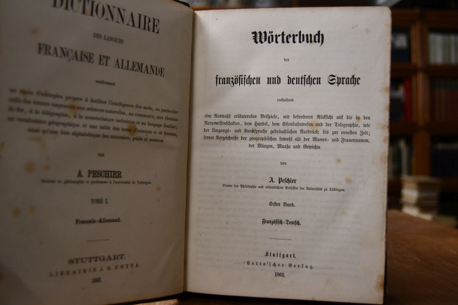 Wörterbuch der französischen und deutschen Sprache enthaltend eine Auswahl erläuternder Beispiele, mit besonderer Rücksicht auf die in den Naturwissenschaften, dem Handel, dem Eisenbahnwesen und der Telegraphie, wie der Umgangs- und Kunstsprache gebräuchlichen Ausdrücke bis zur neuesten Zeit; ferner Verzeichnisse der geographischen sowohl als der Manns- und Frauennamen, der Münzen, Maaße und Gewichte. 2 Bde. (komplett).