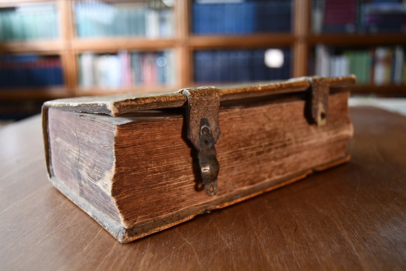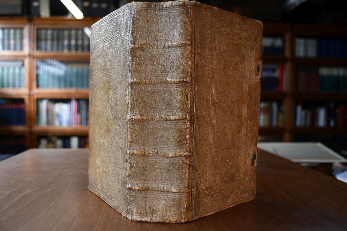 Format 22 x 15 cm, Schweinsleder auf 5 Bünden mit 2 (1 fehlt) Schließen