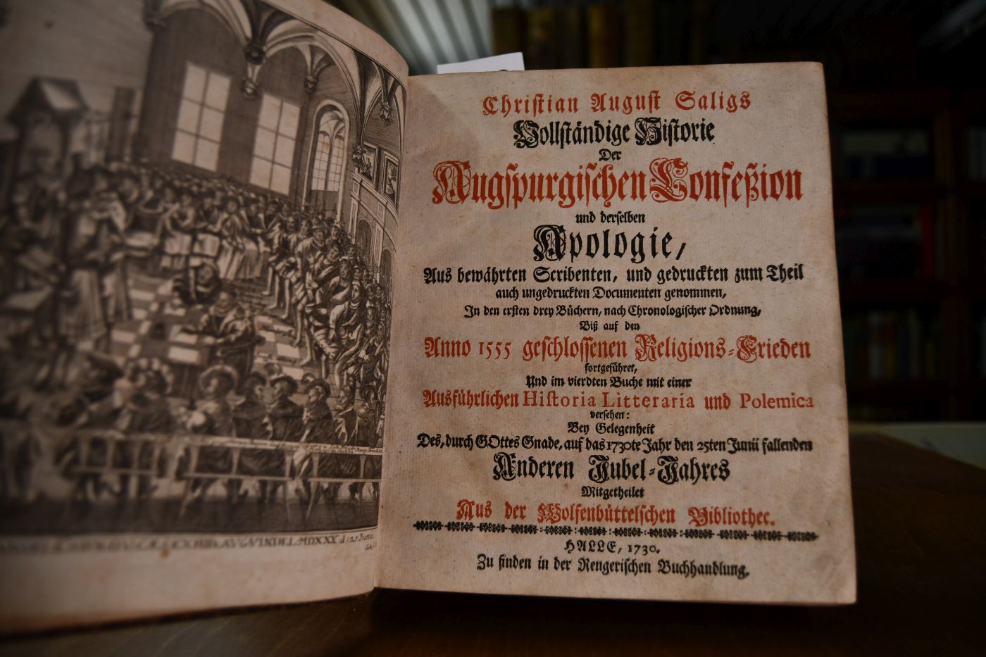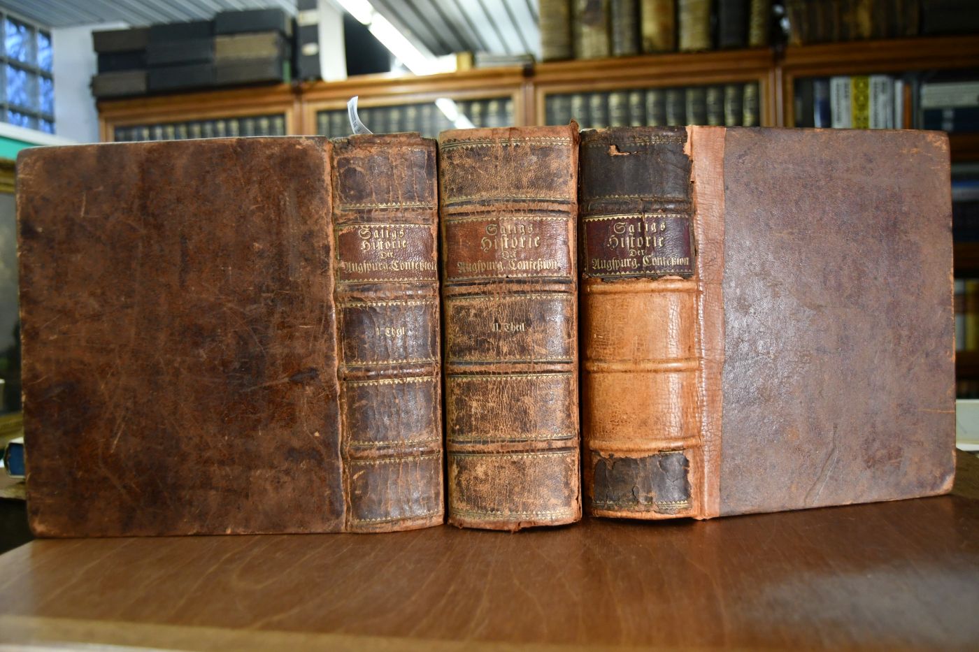 Beschreibung Einband berieben und bestoßen. Band 3 mit erneuertem Rücken unter Übernahme einiger origninaler Rückenfragmente. Textspiegel etwas gebräunt und immer wieder fleckig. Mit dem gestochenen Wappenexlibris von Christian Gottlieb Joecher auf den Innendeckeln. VD18 10759689. ADB XXX, 232.. Erste Ausgabe dieser umfangreichen Geschichte des Augsburger Bekenntnisses, vollständig in 3 Bänden. Christian Gottlieb Jöcher (* 20. Juli 1694 in Leipzig; † 10. Mai 1758 ebenda) aus dessen Bibliothek die Bände stammen war ein deutscher Gelehrter, Bibliothekar und Lexikograf.