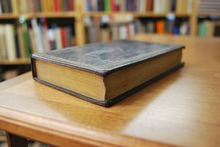 Format 17 x 11 cm, geprägtes Leder mit umlaufendem, stumpfem Goldschnitt