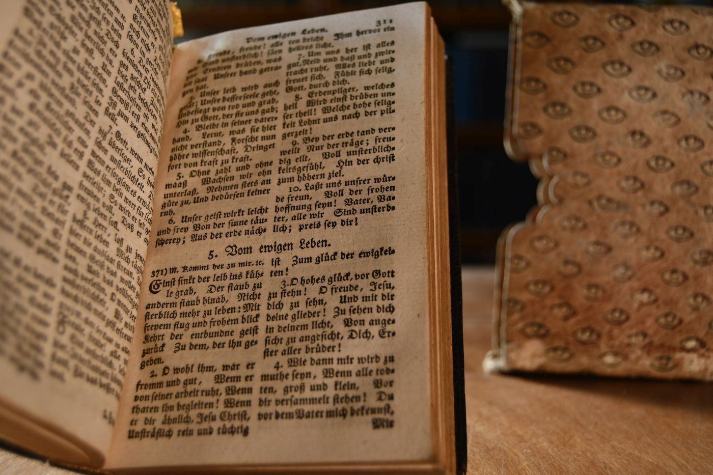 Format 17 x 11 cm, Leder auf 5 Bünden mit umlaufenden, stumpfem Goldschnitt im OSchuber