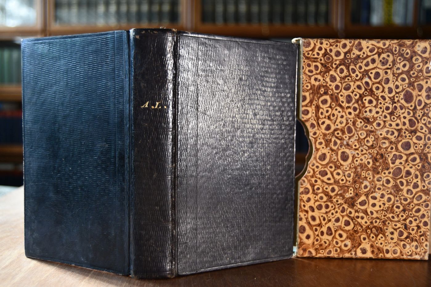 Format 17 x 11 cm, Leder mit Stegrandvergoldung und umlaufenden Goldschnitt im OSchuber