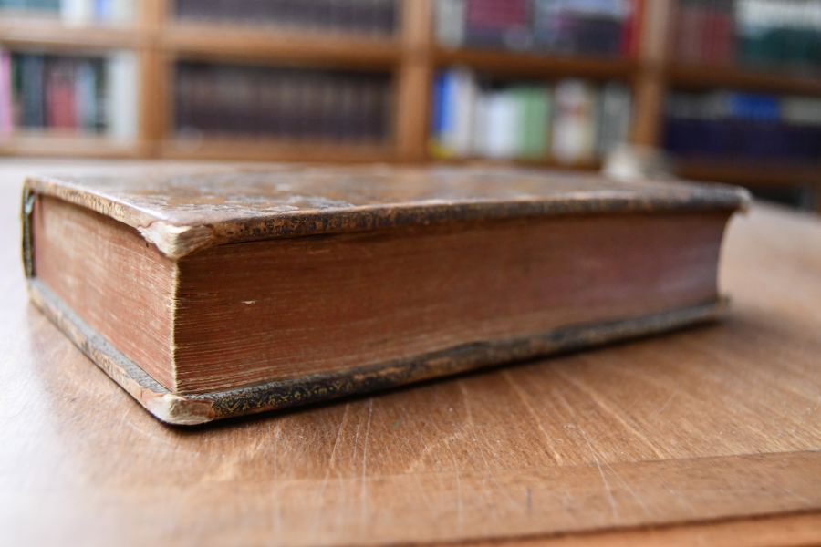 Format 20 x 14 cm, Leder auf fünf echten Bünden, Stegrandvergoldung, 2 Rückenschilden und umlaufendem Rotschnitt