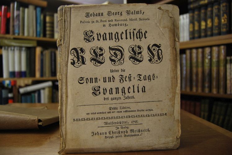 Beschreibung Buchblock mit umlaufendem Rotschnitt, dieser fleckig und angeschmutzt. Titel und erste zwei Blatt sowie letztes Blatt lose, angeschmutzt, mit Einrissen und quetschfaltig. Innen gelegentlich fleckig. Gutes Leseexemplar. "Johann Georg Palm (* 7. Dezember 1697 in Hannover; † 17. Februar 1743 in Hamburg) war ein deutscher lutherischer Theologe. Johann Georg Palm war der Sohn des Hannoveraner Advokaten Johann Palm (* 1661 (?); † 19. Februar 1733), der am 22. November 1693 Dorothea Hedwig Heise geehelicht hatte. Er besuchte Schulen in Hannover. Danach immatrikulierte er sich 1714 an der Universität Jena, wo er sich der Theologie sowie den älteren und den neuen Sprachen zuwandte. 1716 schloss er sein Studium ab und Herzog August Wilhelm nahm ihn in das Kloster Riddagshausen auf. Palm amtierte seit September 1720 als Reiseprediger seines Gönners, des Herzogs, und seit Juni 1723 als dessen Hofkaplan zu Wolfenbüttel. Am 26. Oktober 1727 wurde er als Nachfolger von Johann Theodor Heinson (1666–1726) zum Hauptpastor an der Hauptkirche Sankt Petri gewählt. Zur Amtseinführung am 15. Dezember hielt er eine Predigt über 1. Korint, 2, 1. 2. Als 1738 Johann Friedrich Winckler verstarb, übertrug man Palm dessen Stelle als Senior von Hamburg. Weitere Amtsanwärter waren die Pastöre Wolf und Neumeister. Beide Ämter hielt Palm bis 1743 inne. Nachfolger in Sankt Petri wurde Ernst Friedrich Mylius, Nachfolgersenior wurde Friedrich Wagner. Im nächsten Jahr verstarb er im Alter von 45 Jahren. Eine Tochter heiratete den Lübecker Kaufmann und Ratsherrn Johann Wilhelm Rettich. Wirken Palm galt als gründlich gelehrter Theologe. Dies und seine als liebenswürdig beschriebenen Züge machten ihn angesehen. Humanitätisch eingestellt, war er tolerant gegenüber Andersdenkenden. In seiner Zeit als Hofkaplan verfasste Palm sein Werk die Fallstricke der Sünde, ein asketisches Werk, das ihn im Gebiet der theologischen Literatur bekannt machte. Ab 1737 lieferte sich Palm eine literarische Fehde mit Johann Gustav Reinbeck. In diesem Jahr nämlich verfasste er eine Abhandlung, in der er die Meinung vertrat, Gott treffe keine Schuld daran, dass durch den Sündenfall das Böse in die Welt getreten sei. Weiter veröffentlichte Palm besonders Predigten, so auch seine vierbändigen evangelischen Reden über die Sonn- und Festtagsevangelien. Die meisten seiner Werke sind asketisch. Andere Werke, so eine kurze Geschichte über die Augsburgische Konfession sowie eine Geschichte von Martin Luthers Bibelübersetzung, sind historischen Inhalts. Die Übersicht über die Geschichte von Luthers Bibelübersetzung lag zunächst nur handschriftlich vor; erst viele Jahre nach seinem Tod wurde das Werk von Johann Melchior Götze gedruckt. Außerdem schrieb Palm für Zeitschriften." (Wikipedia)