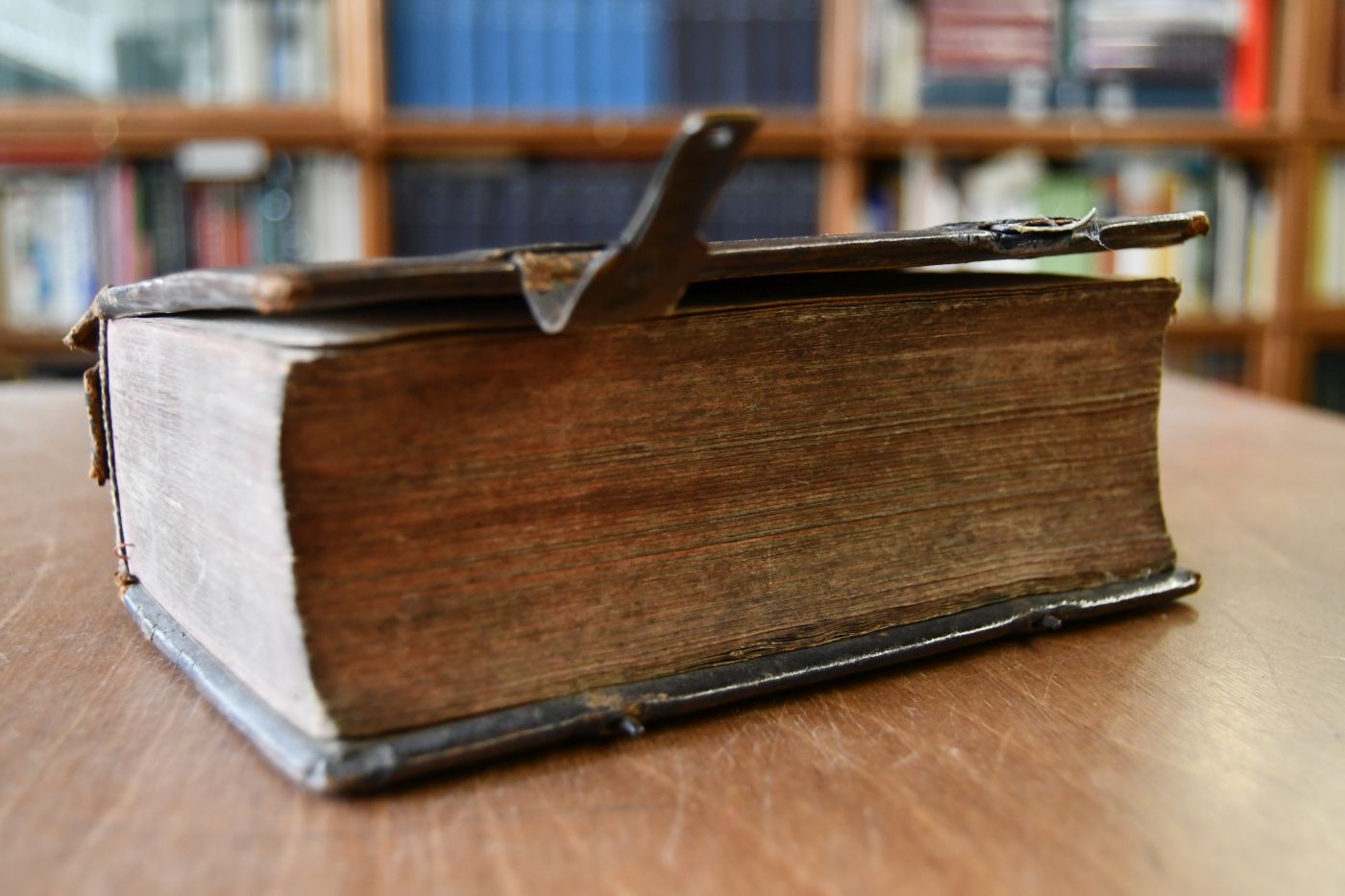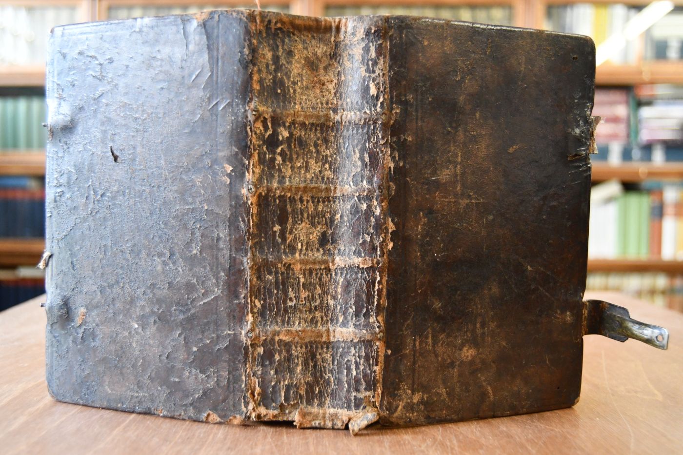 Format 19 x 12 cm, Leder mit 4 Bünden und umlaufendem, abgegriffenen Farbschnitt und einer Schließe.