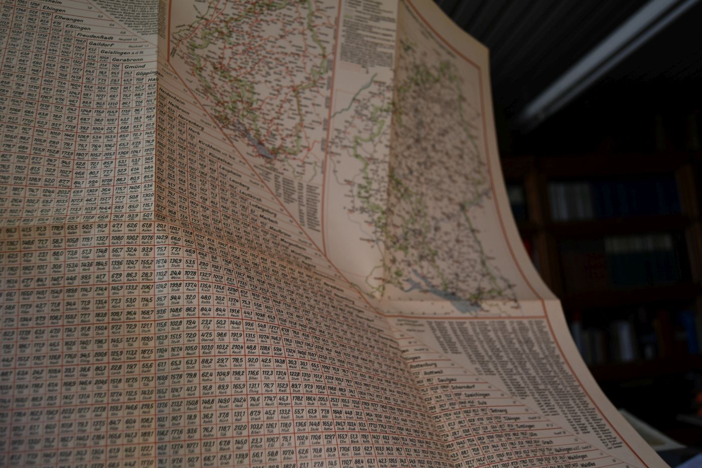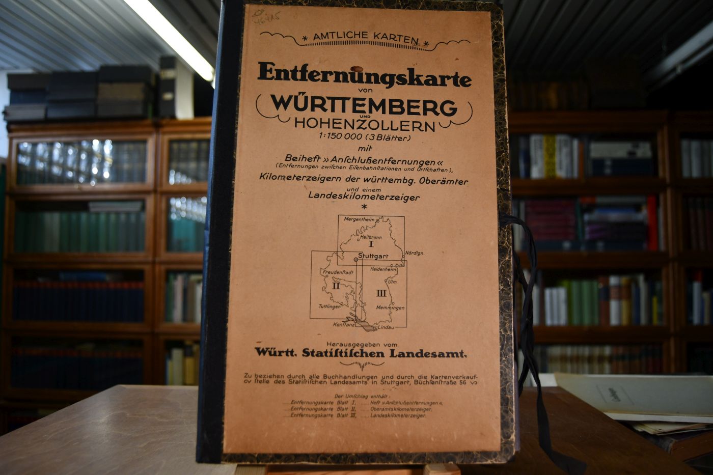 Entfernungskarte, von Württemberg und Hohenzollern 1150 000 (3 Blätter) mit Beiheft "Anschlußentfernungen", Kilometerzeigern der württemb. Oberämter und einem Landeskilometerzeiger.