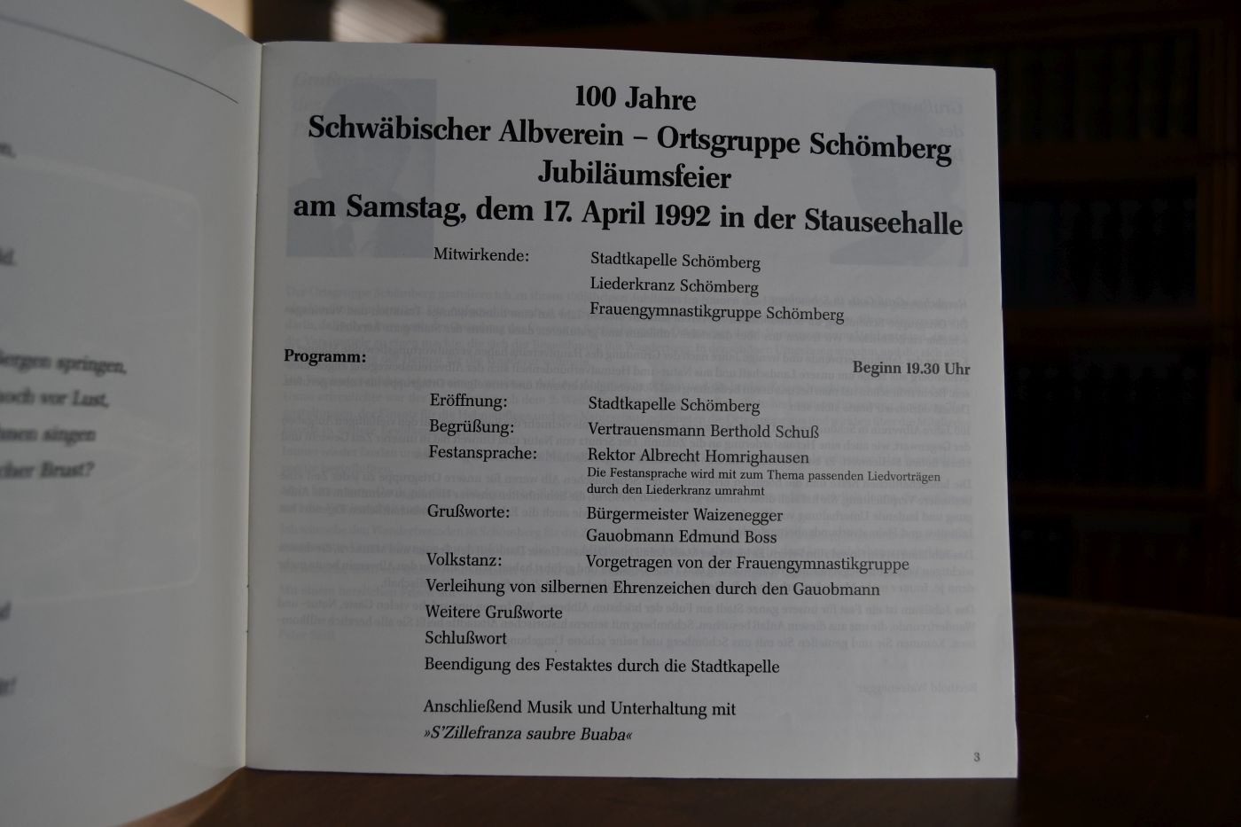 100 Jahre Schwäbischer Albverein - Ortsgruppe Schömberg, Jubiläumsfeier am Samstag, dem 17. April 1992 in der Stauseehalle.