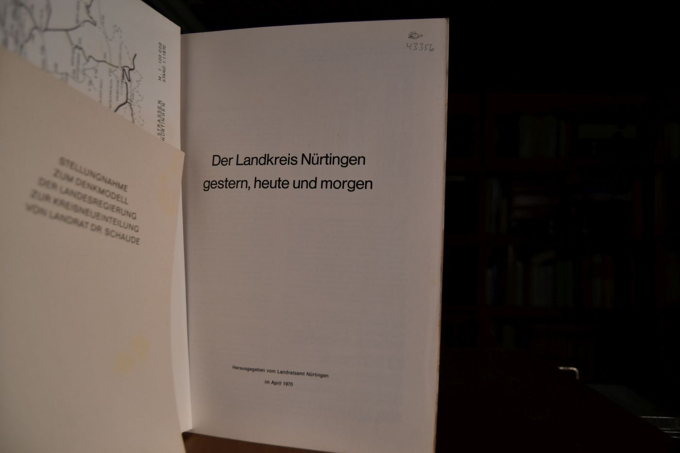 Der Landkreis Nürtingen gestern, heute und morgen. Beiliegend Stellungnahme zum Denkmodell der Landesregierung zur Kreisneueinteilung von Landrat Schaude, 9 S., 21 x 15 cm, Broschur.