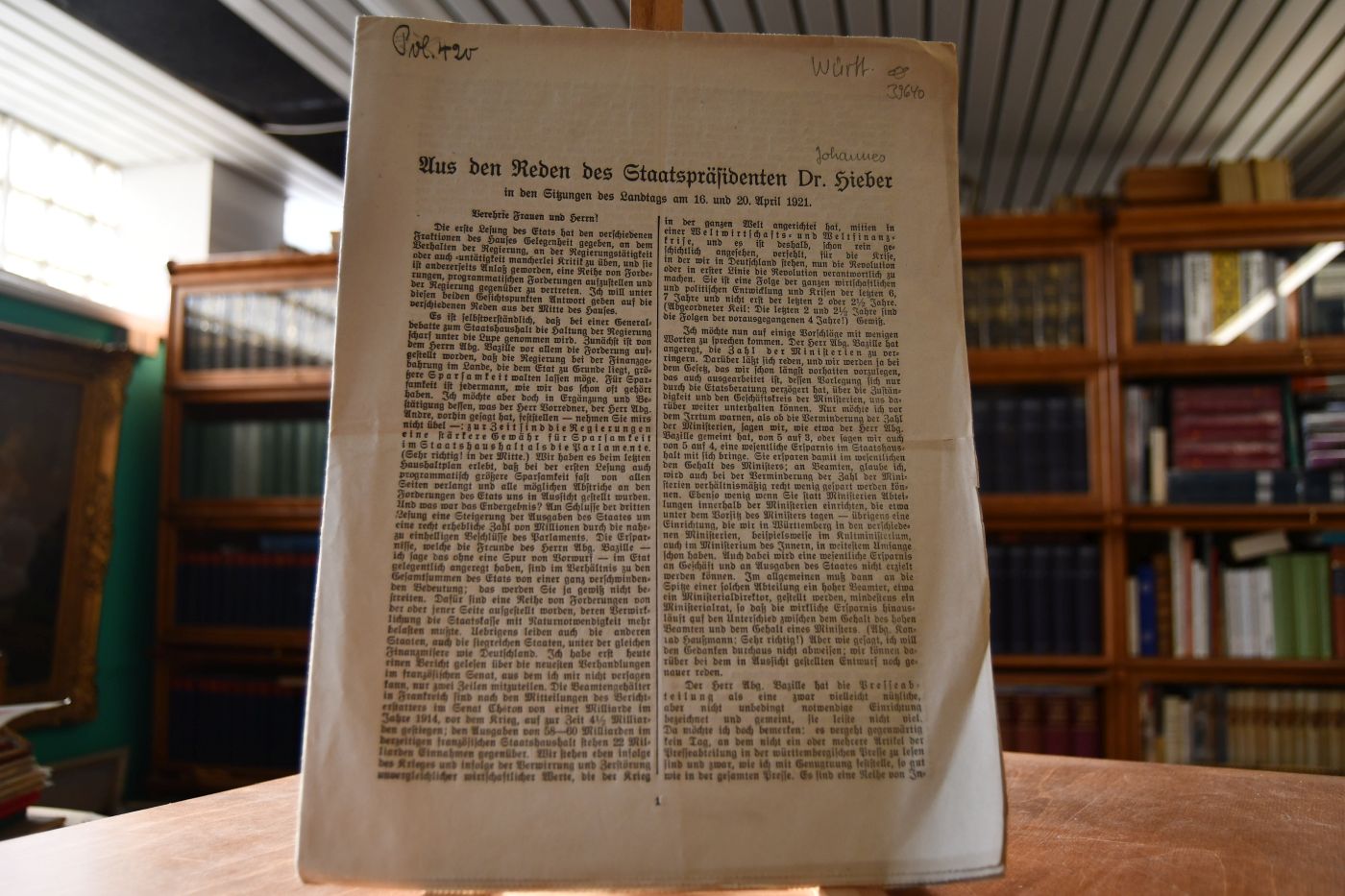Aus den Reden des Staatspräsidenten Dr. Hieber in den Sitzungen des Landzags am 16. und 20. April 1921.