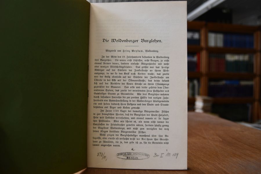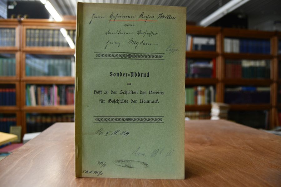 Beschreibung Bibliotheksexemplar (K.Preuss. Geh. Staatsarchiv Berlin) mit den üblichen Stempeln und Eintragungen. Handschriftliche Widmung des Verfassers auf dem Vorderdeckel.