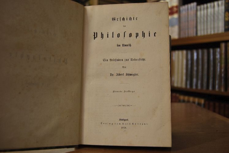 Beschreibung Einband berieben und bestoßen. Handschriftliche Widmung auf Vorsatz. Innen durchgehend fleckig. Gutes Leseexemplar. "Albert Schwegler (* 10. Februar 1819 in Michelbach an der Bilz; † 6. Januar 1857 in Tübingen) war ein Theologe, Philosoph und Historiker. Albert Schwegler wurde als ältester Sohn des württembergischen Pfarrers Matthäus Eberhard Schwegler am 10. Februar 1819 in Michelbach an der Bilz bei Schwäbisch Hall geboren. Für eine Laufbahn als Geistlicher vorgesehen, besuchte er die Lateinschule in Schwäbisch Hall, von 1832 bis 1836 das Seminar in Schöntal und ab 1836 das Tübinger Stift sowie die Universität Tübingen. Schwegler nahm auch am studentischen Verbindungsleben teil. Die Zeit seines Studienabschlusses 1840 war geprägt durch erbitterte Auseinandersetzungen zwischen den dominierenden konservativen Kreisen der evangelischen Landeskirche in Württemberg auf der einen Seite und der durch Hegel beeinflussten historisch-kritischen „Tübinger Schule“ um den Kirchenhistoriker Ferdinand Christian Baur auf der anderen. Aus der theologiegeschichtlich bedeutsamen „Tübinger Schule“ ging auch Schweglers wichtigster akademischer Lehrer, der Theologe und Religionskritiker David Friedrich Strauß, hervor. Ein Stipendium ermöglichte dem Studenten eine ausgedehnte Deutschlandreise mit längerem Aufenthalt in Berlin. 1841 wurde Schwegler von der Philosophischen Fakultät der Berliner Universität aufgrund einer Abhandlung über die Philopatris des antiken Philosophen und Schriftstellers Lucian von Samosata promoviert. Im Herbst 1842 kehrte er nach Schwäbisch Hall zurück, von wo aus er sich vergeblich um eine Anstellung bemühte. Als Anhänger Hegels hatte er keine Aussicht auf eine Anstellung in der württembergischen Landeskirche, obwohl er Jahrgangsbester war und mehrere Preise gewonnen hatte. Als Privatdozent der Philosophie und Philologie führte er nach seiner Habilitation über Plato ab 1843 in Tübingen ein ärmliches Außenseiterdasein. Hier publizierte er seine erste kirchengeschichtliche Arbeit Der Montanismus und die christliche Kirche des 2. Jahrhunderts (1841). Von 1843 bis 1848 redigierte er die „Jahrbücher der Gegenwart“, eine namhafte literarische Zeitschrift, für die u.a. Friedrich Theodor Vischer, Ludwig Feuerbach, Johann Gustav Droysen und Jakob Friedrich Reiff schrieben. 1844 veröffentlichte Schwegler eine Geschichte des frühen Christentums, die für ihre „meisterhafte Darstellung“ gerühmt wurde. Von der Theologie, in der er keine berufliche Stellung hatte erringen können, wandte er sich 1846 nach einer Italienreise der Altertumswissenschaft zu. Seine 1846/47 als eine Art Nebenwerk verfasste Geschichte der Philosophie im Umriß entwickelte sich zu einem in mehrere Fremdsprachen übersetzten und bis in die 1950er Jahre neu aufgelegten Standardwerk. Erst die Märzrevolution von 1848 ermöglichte die Ernennung Schweglers zum Professor für „Römische Litteratur und Alterthümer“ in Tübingen. Immer mehr wurde für ihn nun die Arbeit an einer monumentalen „Römischen Geschichte“ zum Lebensinhalt, deren ersten Band er 1853 vorlegen konnte. Die private Existenz jedoch blieb krisenhaft: Der Junggeselle vereinsamte, zog sich aus dem öffentlichen Leben zurück, vertiefte sich völlig in seine Studien und starb – wohl aufgrund dieser Überlastung – mit achtunddreißig Jahren am 6. Januar 1857. Nach seinem frühen Tod wurde Schwegler als „Mann von ganz ungewöhnlicher Begabung, der überall, wo er eingriff, Bedeutendes leistete“, gewürdigt. Trotzdem geriet er bald in Vergessenheit. Seine kirchengeschichtlichen Arbeiten wurden durch Ferdinand Christian Baur und David Friedrich Strauß, die „Römische Geschichte“ durch Theodor Mommsen in den Schatten gestellt. Abgesehen von der Geschichte der Philosophie haben seine Werke lediglich in der Fachwissenschaft Anerkennung gefunden. Eine Geschichte der griechischen Philosophie erschien 1859 posthum (herausgegeben von Karl Reinhold von Köstlin)." (Wikipedia)