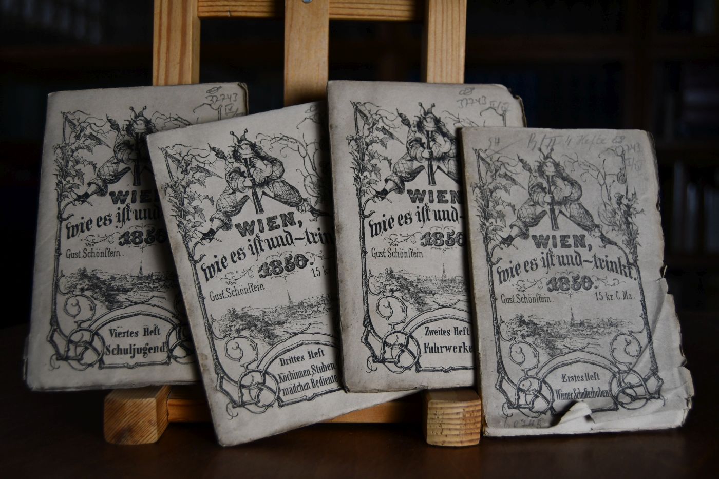 Wien wie es ist und - trinkt. 4 Hefte (komplett). 1. Wiener Schusterbuben. 2. Wiener Fuhrwerke. 3. Wiener Köchinnen, Wiener Stubenmädchen, Wiener Bediente. 4. Die Wiener Schuljugend und Studierende.