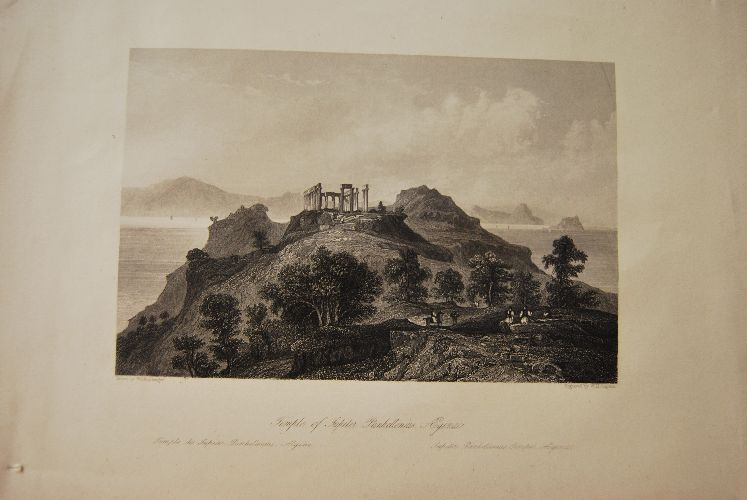 Beschreibung Stahlstich. Etwas fleckig. Dekorative Ansicht der Landspitze Atticas mit den Tempel- Ruinen und Blick auf den Saronischen Golf.