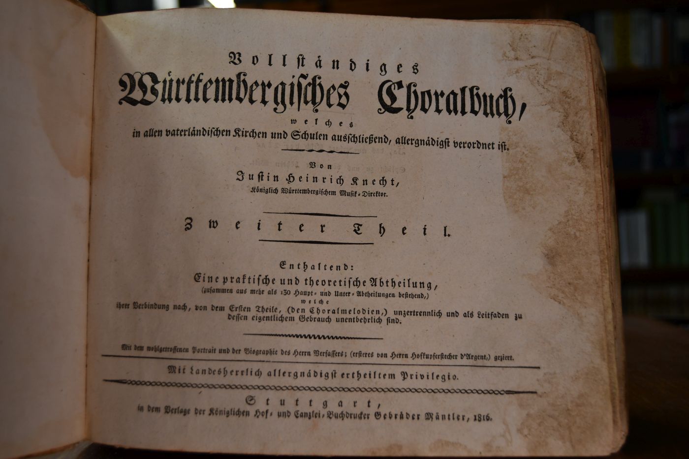 Beschreibung Einband berieben, bestoßen und mit deutlichem Verlust des Überzugpapiers. Bindung gelockert und einige Lagen lose und vorgefallen sowie mit RAndeinrissen. Durchgehend fleckig und feuchtigkeitsrandig. Einige Tintenflecke. Handschriftliche Besitzereinträge (u.a. Stiftung Derendingen) auf Innendeckel und Vorsätzen. Porträtkupfer mit Randeinriss (nicht in die Abbildung hineinreichend). S. 285/286 und 287/288 sind vertauscht, ebenso 289/290 und 291/292. Heyd II, 354. Johann Heinrich Knecht (1752-1817) war in seiner Jugend Kompositeur für das städtische Liebhaberorchester Wielands in Biberach. Eine Inkunabel der Lithographie.