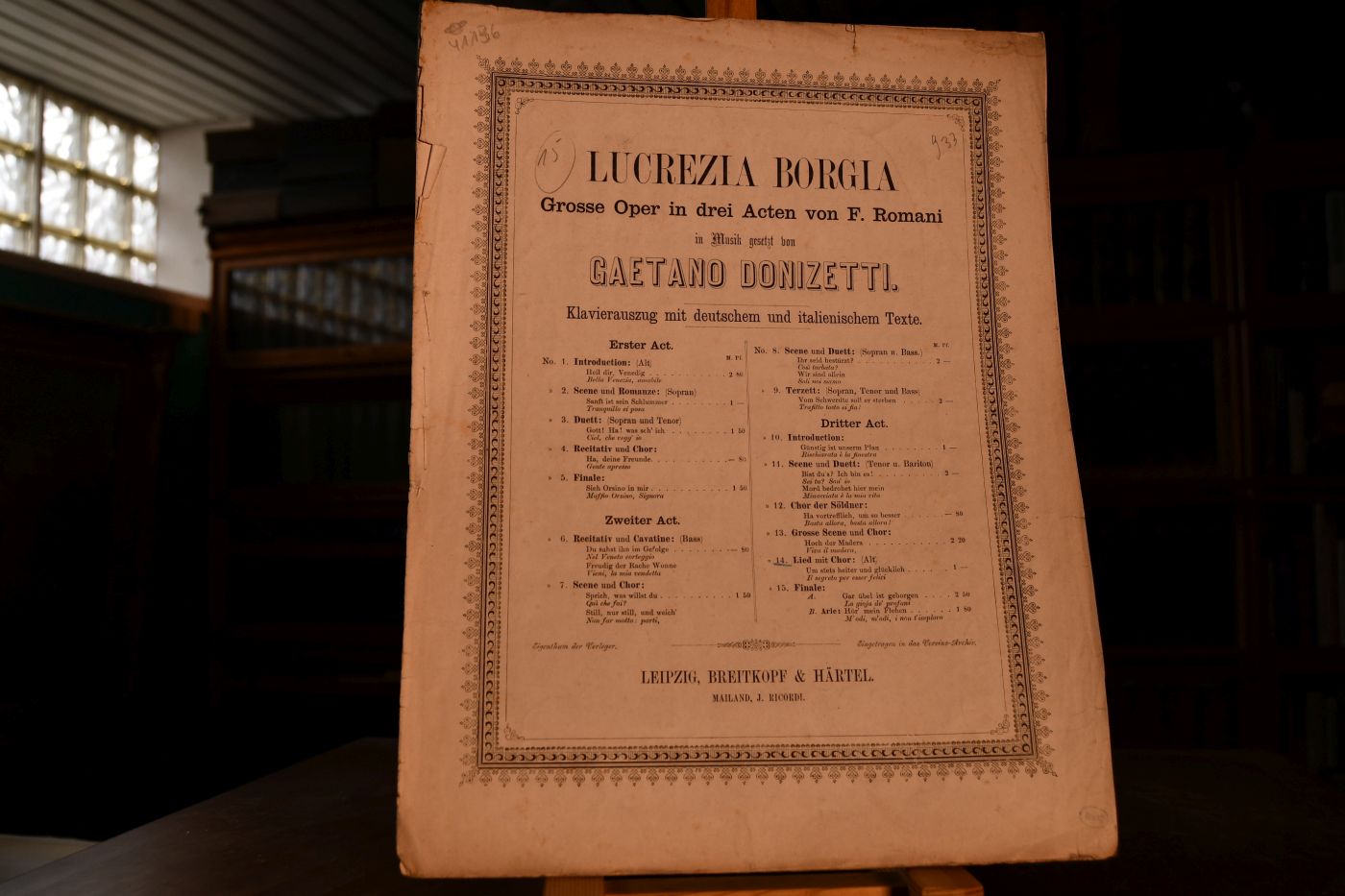 Lucrezia Borgia. Grosse Oper in drei Acten von F. Romani in Musik gestzt von Gaetano Donizetti. Klavierauszug mit deutschem und italienischem Texte. Nr 14 Lied mit Chor Um stets heiter und glücklich (Alt).