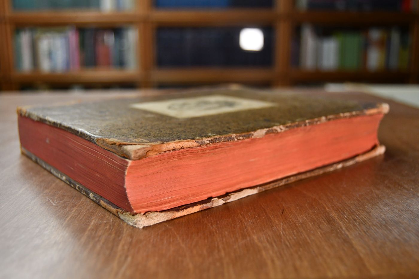 Format 22 x 19 cm, Halbleder der Zeit mit Rückenschild und umlaufendem Rotschnitt