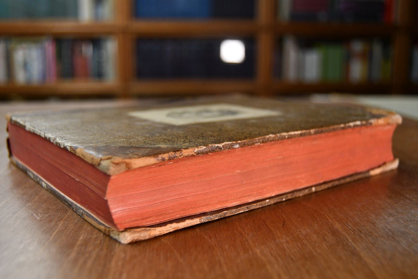 Format 22 x 19 cm, Halbleder der Zeit mit Rückenschild und umlaufendem Rotschnitt