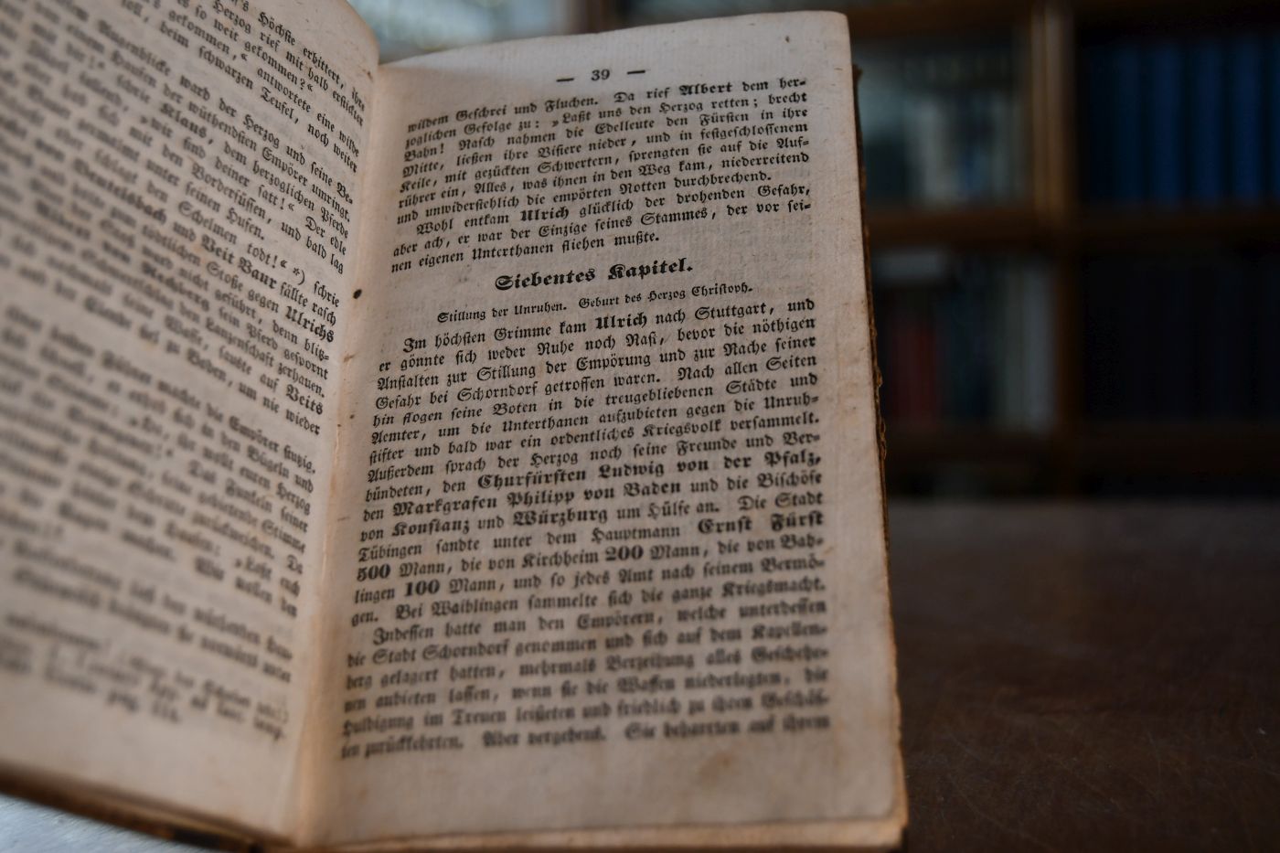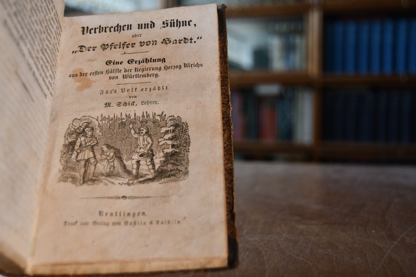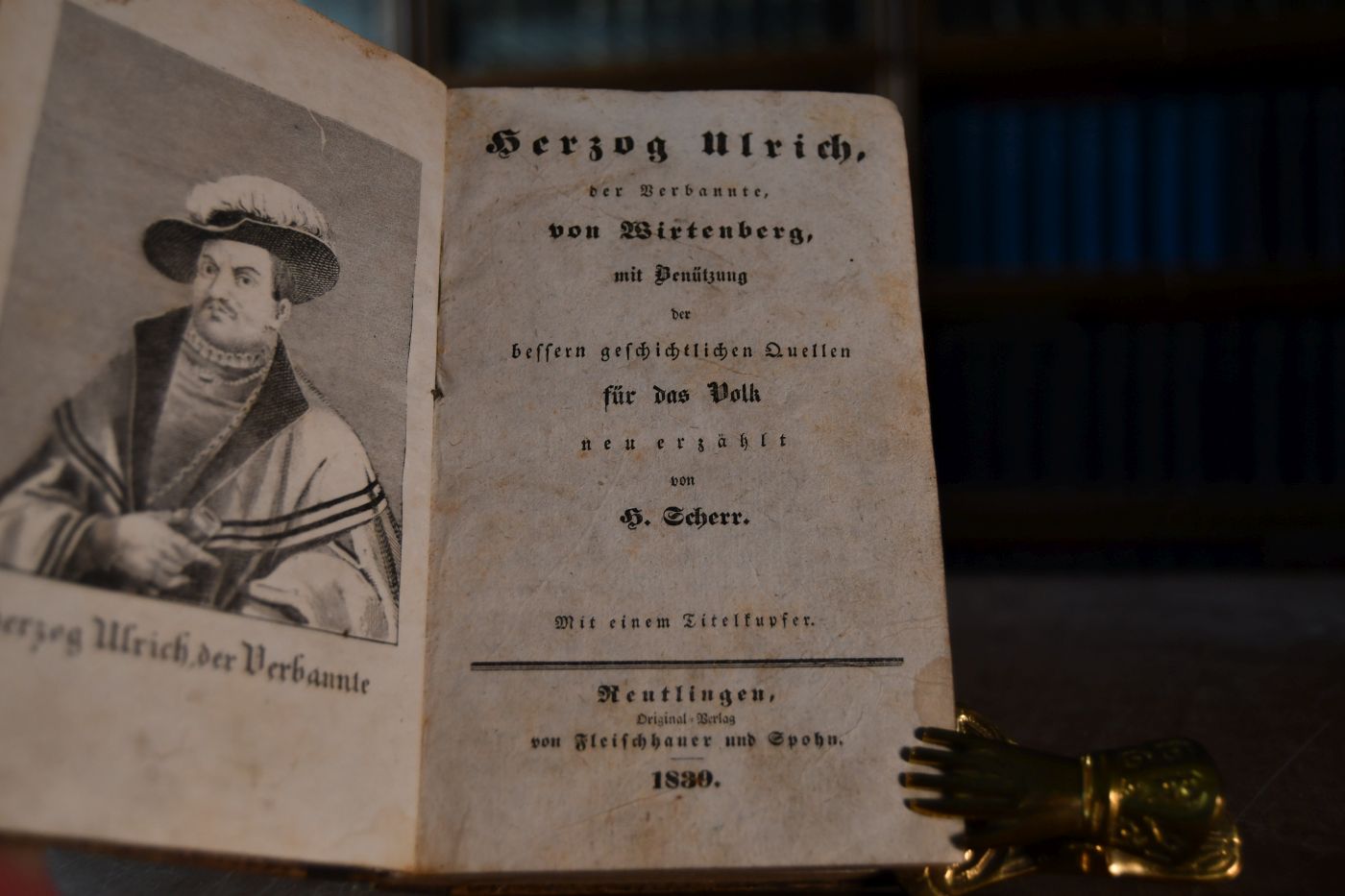 Herzog Ulrich, der Verbannte, von Wirtenberg, mit Benützung der besten geschichtlichen Quellen für das Volk neun erzählt von H. Scherr. Beigebunden M. Schick Verbrechen und Sühne, oder "Der Pfeifer von Hardt." Eine Erzählung aus der ersten Hälfte der Regierung Herzog Ulrichs von Württemberg; Reutlingen, Enßlin & Laiblin, o.J., 36 S.