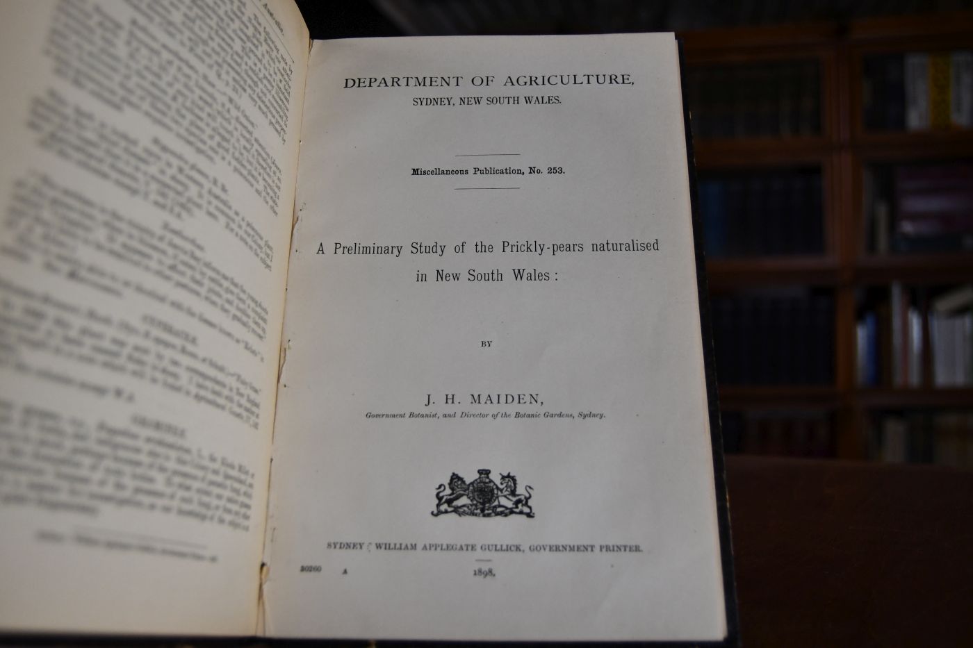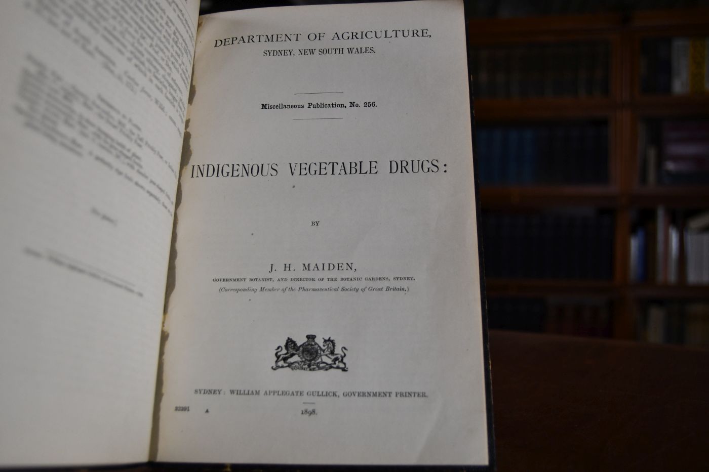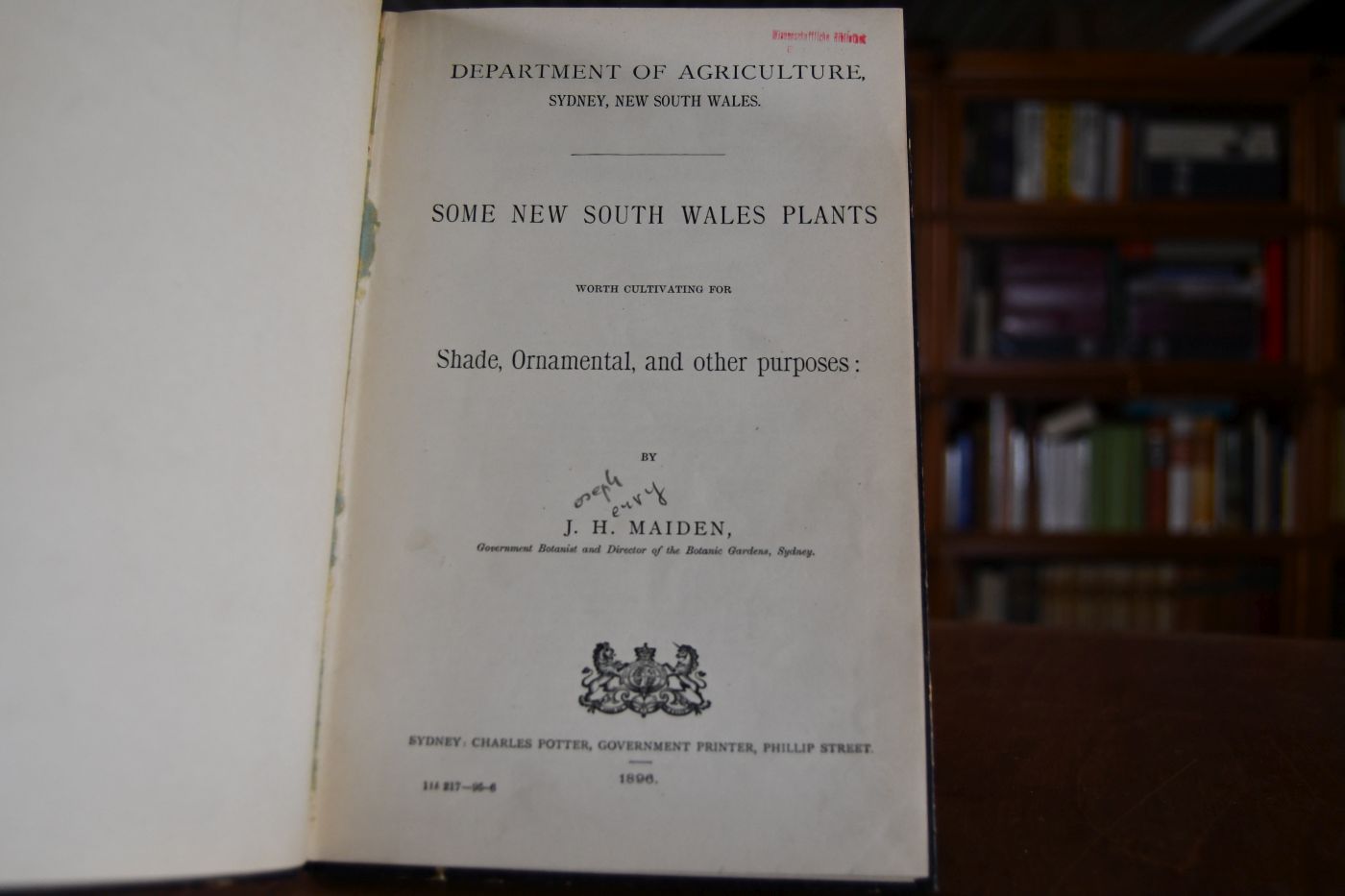 Some new South Wales plants worth cultivating for Shade, Ornamental, and other purposes. Beigebunden 1. Joseph Henry Maiden Plants reputed to be poisonous to stock in Australia, 1897, Sydney, Gullick, 22 S. 2. Joseph Henry Maiden A Preliminary study of the Prickly-pears naturalised in New South Wales, Sydney, Gullick, 1898, 30 S., 3. Joseph Henry Maiden Indigenous vegetable drugs, Sydney, Gullick, 1898, 22 S., 4. Joseph Henry Maiden Indigenous vegetable drugs Part II, Sydney, Gullick, 1899, 24 S.