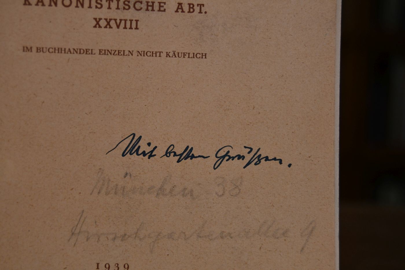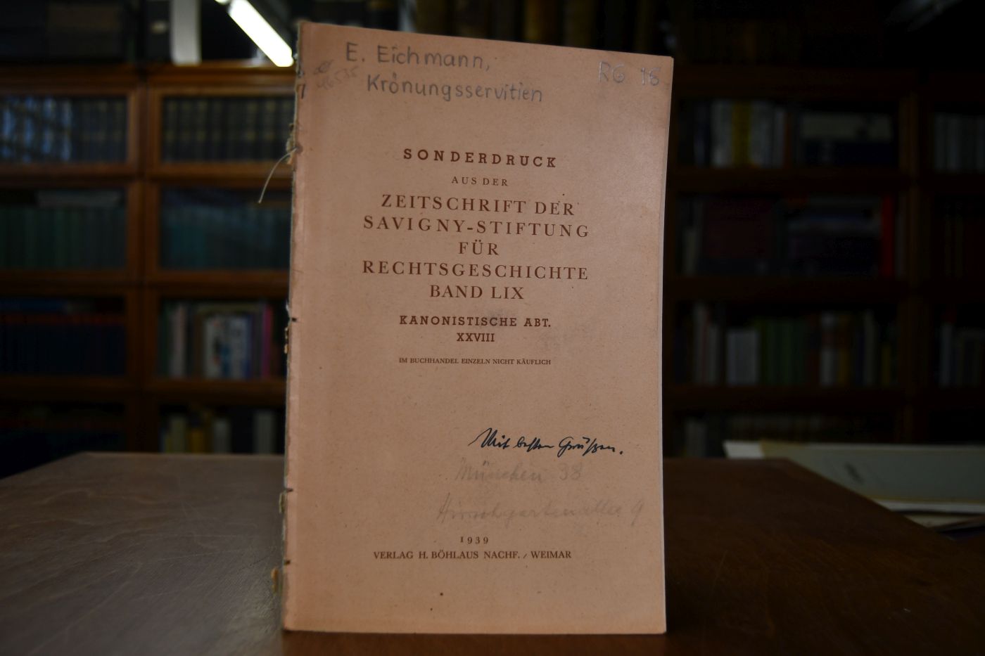 Beschreibung Rücken mit Einsägungen und Verlust. Handschriftliche Widmung von Eduard Eichmann auf dem Vorderdeckel.