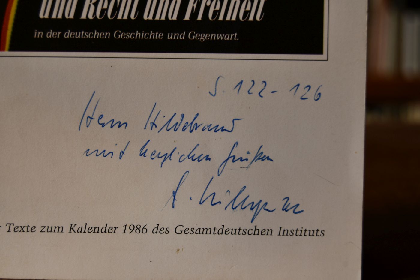 Beschreibung Einband berieben und bestoßen. Mit handschriftlicher Widmung von Andreas Hillgruber auf dem Broschurdeckel. "Andreas Fritz Hillgruber (* 18. Januar 1925 in Angerburg, Ostpreußen; † 8. Mai 1989 in Köln) war ein deutscher Historiker und Spezialist für die militärische, politische und diplomatische deutsche Geschichte zwischen 1871 und 1945. Andreas Hillgruber, Sohn eines Lehrers, wuchs in Ostpreußen auf und legte an der Staatlichen Hufenschule – Oberschule für Jungen in Königsberg das Abitur ab. Von 1943 bis 1945 diente er als Soldat in der Wehrmacht. Als Unteroffizier kam er 1945 zunächst in amerikanische, anschließend bis 1948 in französische Kriegsgefangenschaft. Nach seiner Freilassung studierte er von 1948 bis 1952 Geschichte, Germanistik und Pädagogik unter anderen bei Percy Ernst Schramm an der Georg-August-Universität Göttingen. Dort promovierte er bei Schramm 1952 mit einer Arbeit über die deutsch-rumänischen Beziehungen im Zweiten Weltkrieg. Von 1954 bis 1964 arbeitete er im höheren Schuldienst, unter anderem am Justus-Liebig-Gymnasium in Darmstadt. Von 1962 bis 1964 war er Oberstudiendirektor an der Marburger Elisabethschule. Nach einem Lehrauftrag an der Philipps-Universität Marburg erfolgte dort seine Habilitation mit der Studie Hitlers Strategie. Politik und Kriegführung 1940/1941. 1967 wurde er Wissenschaftlicher Rat und Professor an der Universität Marburg. Von 1968 bis 1972 war er ordentlicher Professor für neuere und neueste Geschichte an der Albert-Ludwigs-Universität Freiburg und zugleich von 1968 bis 1970 „Leitender Historiker“ des Militärgeschichtlichen Forschungsamtes (MGFA) in Freiburg im Breisgau. Von 1972 bis zu seinem Tod 1989 war er dann Ordinarius für mittlere und neuere Geschichte an der Universität zu Köln. Hillgruber betreute laut einer ihm zu Ehren herausgegebenen Gedenkschrift[1] 55 Doktoranden und 4 Habilitanden u.a. Jürgen Arne Bach, Rainer Blasius, Gotthard Breit, Jost Dülffer, Jürgen Förster, Friedrich Forstmeier, Günther W. Gellermann, Michael Geyer, Emily Haber, Christian Hartmann, Hans-Georg Kraume, Frank-Lothar Kroll, Bernd Martin, Nikolaus Meyer-Landrut, Horst Mühleisen, Manfred Nebelin, Karl-Volker Neugebauer, Klaus Olshausen, Reiner Pommerin, Klaus Reinhardt, Ralf Georg Reuth, Klaus-Jörg Ruhl, Marion Thielenhaus, Jochen Thies, Vera Torunsky und Günter Wollstein. Wesentlichen Einfluss nahm er darüber hinaus auf Klaus Hildebrand, der bei ihm in Marburg hörte. Hillgruber war langjähriger Rezensent geschichtswissenschaftlicher Neuerscheinungen für die Historische Zeitschrift (HZ). Zwischen 1965 und 1977 schrieb Hillgruber 197 Rezensionen in der HZ unter dem damaligen Herausgeber Theodor Schieder. 1969 wurde er Mitglied der CDU. Seit 1960 war Hillgruber mit Karin Zierau verheiratet, mit der er drei Kinder hatte, zwei Söhne und eine Tochter. Der Hallenser Gräzist Michael Hillgruber ist der ältere, der Bonner Staatsrechtler Christian Hillgruber der jüngere Sohn Andreas Hillgrubers." (Wikipedia)