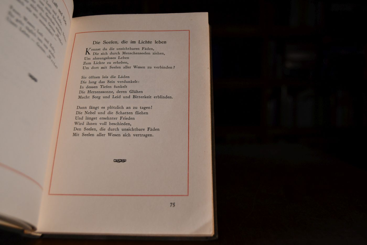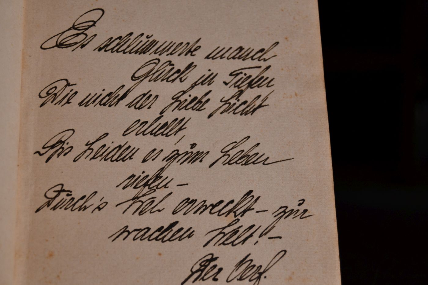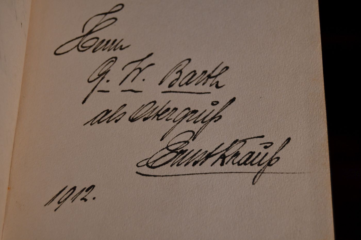 Beschreibung Einband berieben, bestoßen und fleckig. Schnitt und Vorsätze fleckig. Vorsatz mit eigenhändigem Gedicht "Es schlummert manch Glück in Tiefen, die nicht der Liebe Licht erhellt, bis Leiden es zum Leben riefen. Durch`s Weh erweckt - zur wachen Welt !" Mit handschriftlicher Widmung an G.W. Barth auf Schmutztitel.