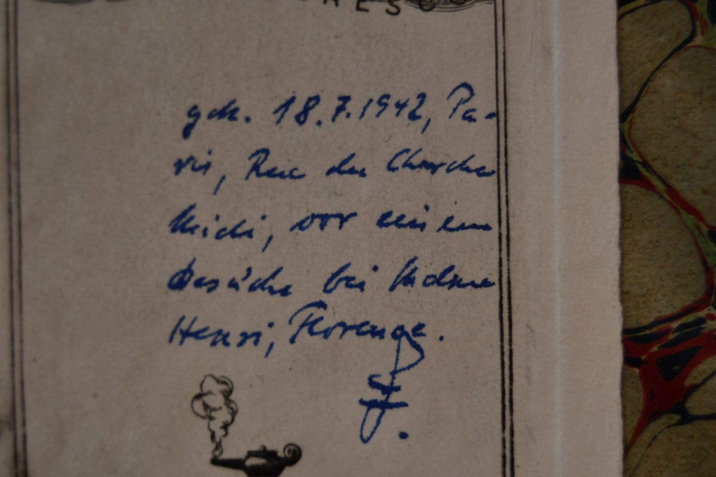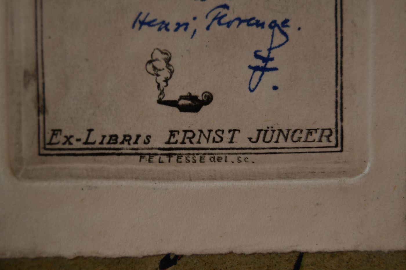 Beschreibung Einband berieben und bestoßen. Falz vor dem Schmutztitel geöffnet. Besitzerstempel (Paul Weiss, Menuisier) auf dem Titel und dem Schmutztitel. Papierbedingt gebräunt. Auf dem Innendeckel das Exlibris von Ernst Jünger (Feltesse) mit dessen handschriftlichem Kaufvermerk: "gek. 18.7.1942, Paris, Rue des Ch... Midi, vor einem Besuche bei Mdme Henri, Florence und dessen handschriftlichem Monogramm.