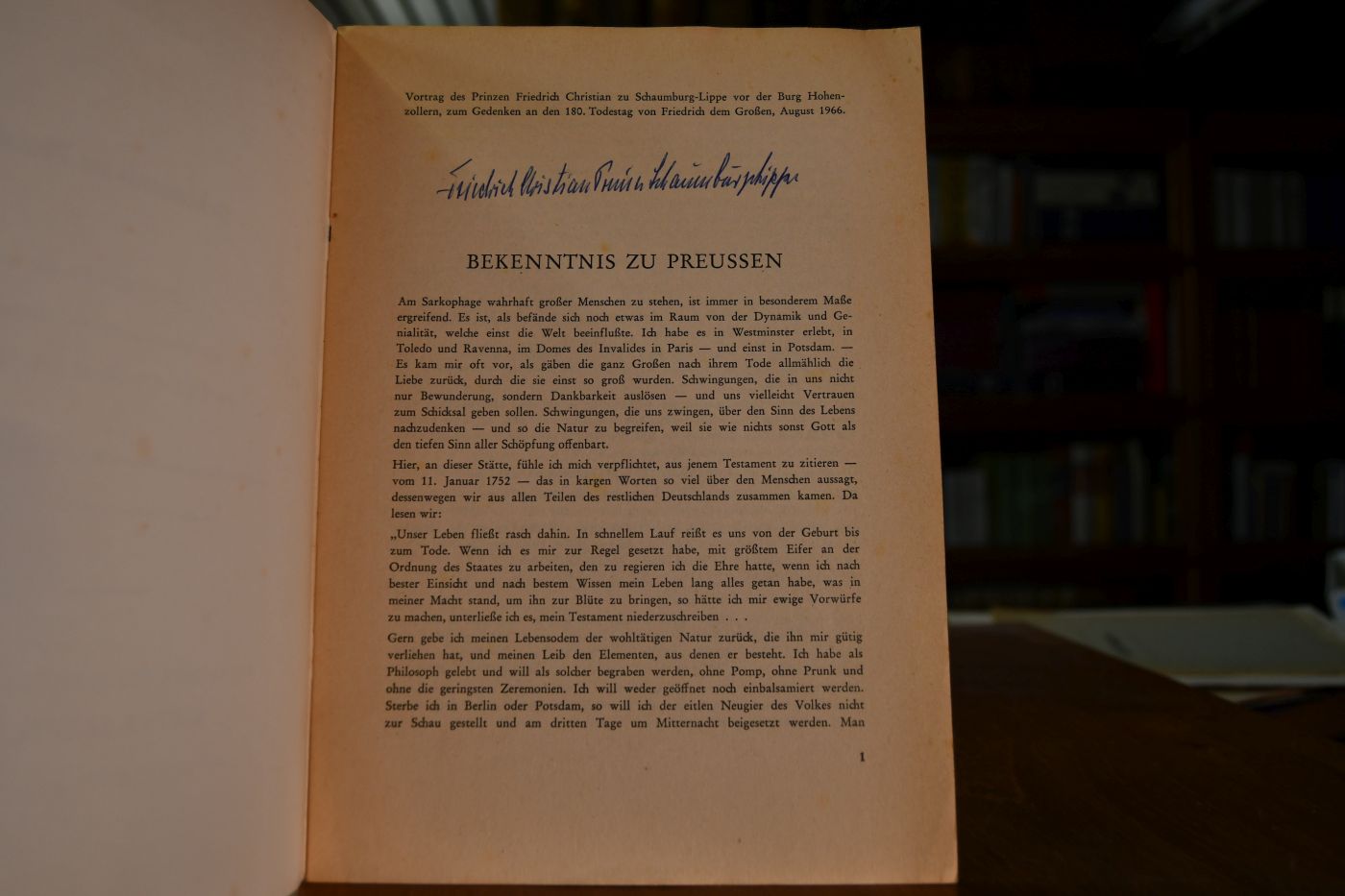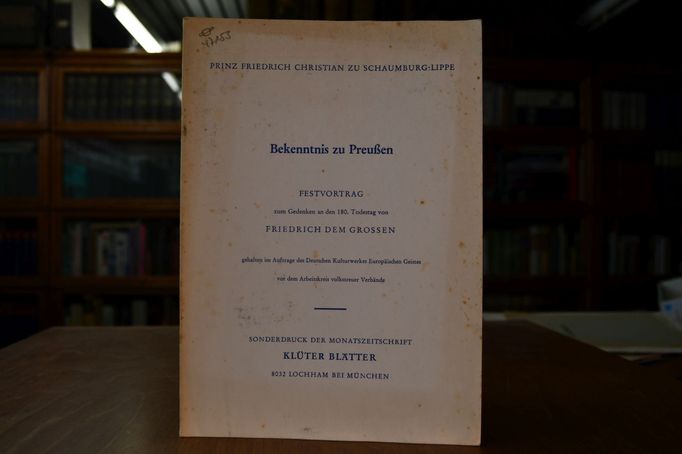 Bekenntnis zu Preußen. Festvortrag zum Gedenken an den 180. Todestag von Friedrich dem Grossen gehalten im Auftrage des Deutschen Kulturwerkes Europäischen Geistes vor dem Arbeitskreis volkstreuer Verbände.