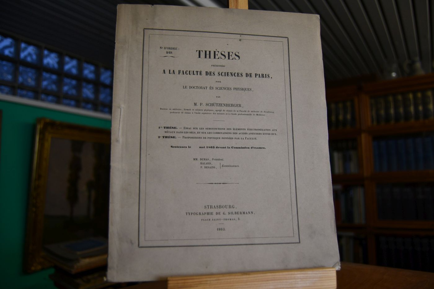 Theses presentees a la Faculte des Sciences de Paris pour le Doctorat es Sciences Physiques, par M. P. Schützenberger, 1re These Essai sur les substitutions des elements electronegatifs aux metaux dans les sels, et sur combinaisons des acides anhydres entre eux. 2e These Propositions de Physique donnees par la faculte.
