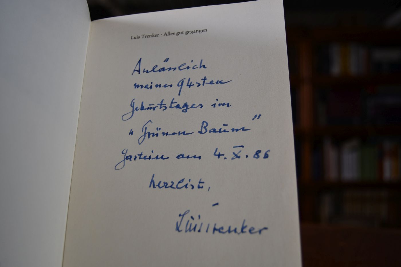 Beschreibung Schutzumschlag berieben und bestoßen. Schiefgelesen. Mit handschriftlicher Widmung von Luis Trenker anläßlich seines 94. Geburtstags im "Grünen Baum" in Gastein am 4.10.1986. Beiliegend 3 private Bilder von dieser Geburtstagsfeier mit Luis Trenker.