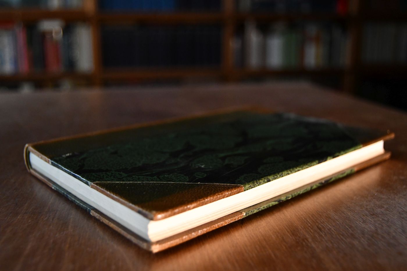 Format 21 x 15 cm, privates Halbleder auf 5 Bünden und eingebundenen Broschurdeckeln