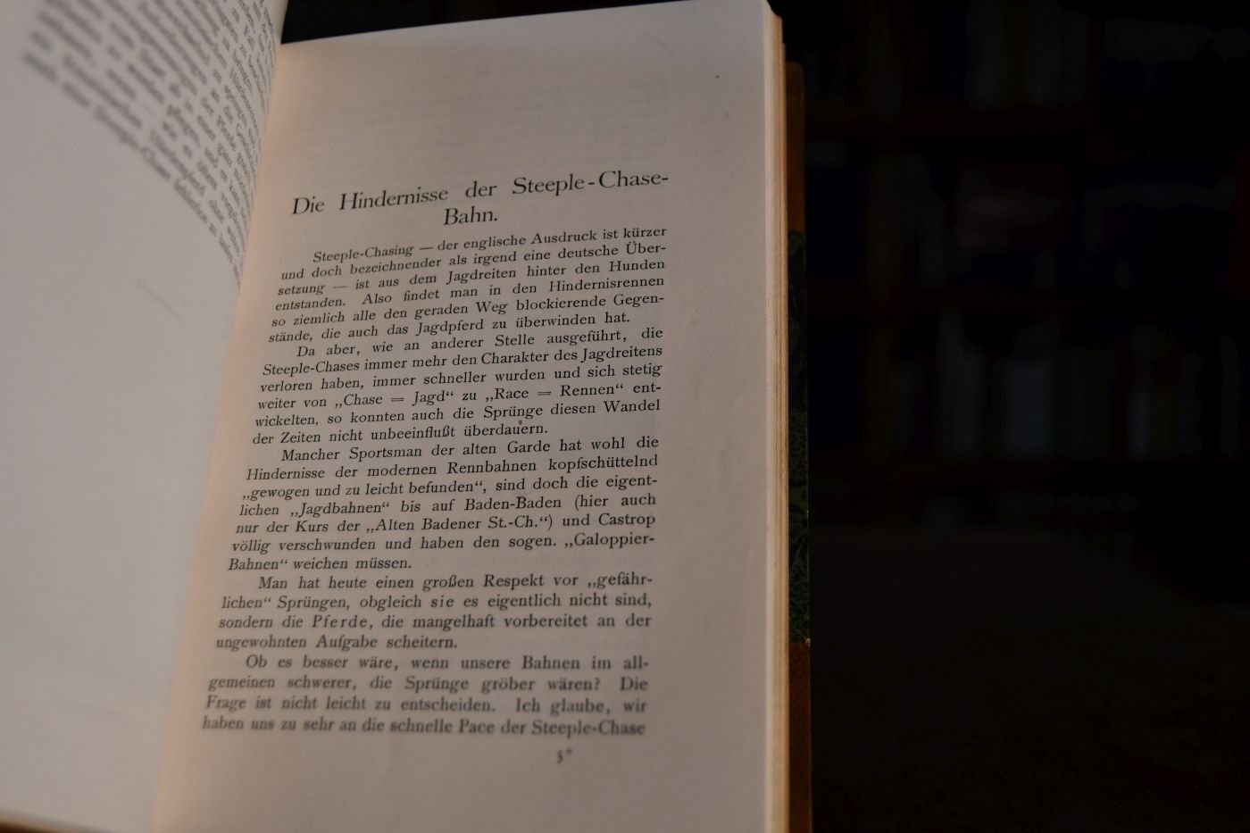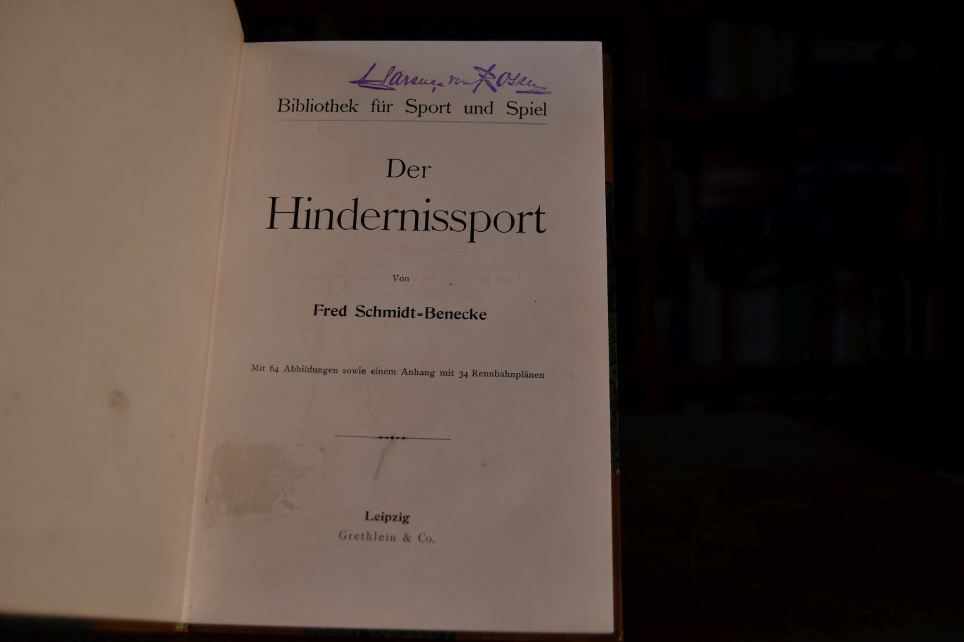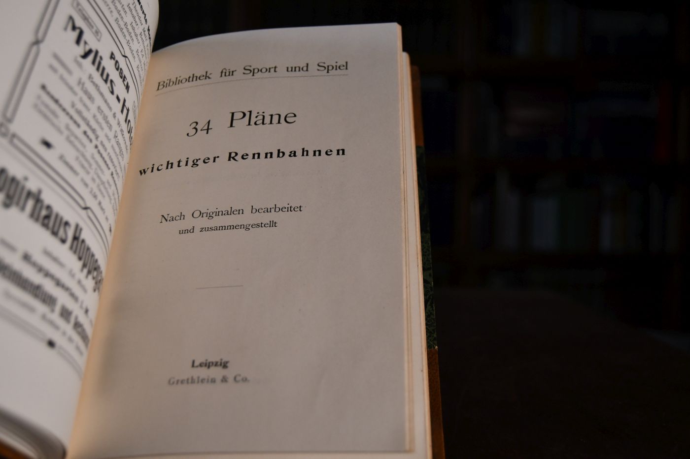 Beschreibung Einband berieben, bestoßen und ausgebleicht. Exlibris von Clarence von Rosen auf dem Innendeckel und seine gestempelte Unterschrift auf Titel und Widmungsseite. Beigebunden: 34 Pläne wichtiger Rennbahnen, Nach Originalen bearbeitet und zusammengestellt, Leipzig, Grethlein, o.J., 47 S. aus der Reihe Bibliothek für Sport und Spiel.