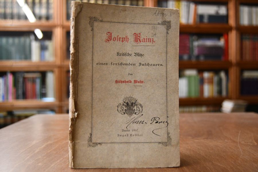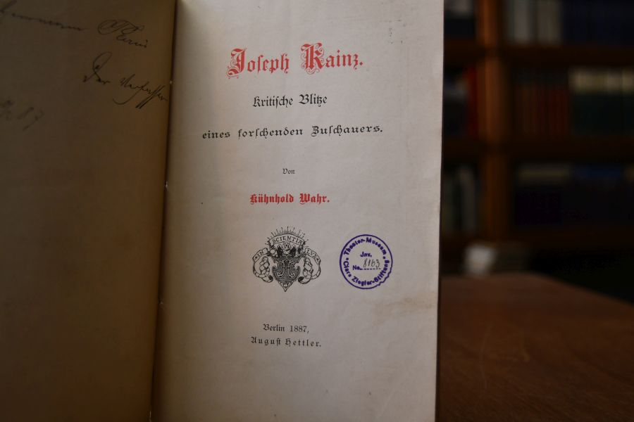 Beschreibung Einband berieben, bestoßen, angeschmutzt, fleckig und am Rücken mit Verlust. Bibliotheksexemplar (Theater-Museum Clara-Ziegler Stiftung. Eselsohrig und unfrisch. Handschriftliche Widmung von Joseph Kainz an Hermann Paris B(erlin) 20. Februar 1887 auf Innendeckel. "Josef Gottfried Ignaz Kainz (* 2. Jänner 1858 in Wieselburg (heute Mosonmagyaróvár); † 20. September 1910 in Wien) war ein österreichischer Schauspieler. Josef Kainz gilt als einer der größten deutschsprachigen Theaterschauspieler. Ihm zu Ehren wurde in Österreich von 1958 bis 1999 jedes Jahr die Kainz-Medaille für bedeutende Leistungen von Schauspielern und Regisseuren verliehen. Kainz war der Sohn des ehemaligen Schauspielers und Eisenbahnbeamten Josef Alexander Kainz und dessen Frau Mathilde (geborene Bernhardt, 1835–1884). Nach dem frühen Unfalltod des Vaters wurde er von seiner Mutter maßgeblich gefördert, die das Theater schätzte und in ihm Talent als Schauspieler erkannte. So wandte sich Kainz der Bühne zu und debütierte als Fünfzehnjähriger am Sulkowskitheater in Matzleinsdorf. 1874 nahm Kainz Schauspielunterricht bei Caesarine Kupfer-Gomansky, erhielt im folgenden Jahr sein erstes Engagement als Liebhaber in Marburg an der Drau und wurde 1876 an das Neue Stadttheater von Leipzig verpflichtet, bevor er 1877 sein Engagement am Meininger Hoftheater antrat. 1879 unternahm Kainz mit diesem Ensemble eine Gastspielreise durch Deutschland, folgte 1880 einem Ruf Ernst von Possarts an das Hof- und Nationaltheater München, wo er wiederholt Hauptrollen in den Separatvorstellungen für König Ludwig II. von Bayern übernahm. Josef Kainz, Emil Rohde (1839–1913) und Franz Innozenz Nachbaur (1830–1903), waren jene drei unter den Münchner Bühnenkünstlern, die zu König Ludwig II. in engeren persönlichen Beziehungen standen.[3] Seit 1883 wirkte Kainz am neu gegründeten Deutschen Theater in Berlin, entwickelte sich dort zum berühmtesten deutschsprachigen Charakterdarsteller seiner Zeit und brillierte unter anderem als Hamlet, Richard II., Don Carlos und Franz Moor in Friedrich Schillers Drama Die Räuber. Die Mutter, mit der er im regen Schriftwechsel stand, folgte ihm nach ihrer Erkrankung 1883 nach Berlin und starb dort im April des Folgejahres. Kainz ließ sie auf dem St.-Hedwigs-Friedhof bestatten.[1] In erster Ehe heiratete er die Deutsch-Amerikanerin Sara Hutzler, die 1893 starb. Im Juni 1898 heiratete er erneut, diesmal Margarethe (Grete) Nathanson, geb. 1858 in Berlin, die ihn um Jahrzehnte überlebte und erst 1950 in Wien starb. 1889 folgte er dem Regisseur Ludwig Barnay an dessen neu eröffnetes Berliner Theater, wurde jedoch nach Differenzen mit diesem kontraktbrüchig. Daraufhin wurde er aus dem Bühnenverein ausgeschlossen. Mit seiner Ehefrau trat er 1891 eine erfolgreiche Amerikatournee an, andere Gastspielreisen führten ihn bis nach Russland (vgl. die Russische Reise von Hermann Bahr). Anschließend spielte Kainz erneut am Deutschen Theater in Berlin, begann 1899 das ersehnte Engagement am Wiener Burgtheater, an das ihn der Direktor Max Burckhardt als Nachfolger Mitterwurzers berief. Hier wurde er bereits am heiligen Abend 1899 zum Hofschauspieler ernannt und wechselte dann ins schwere Charakterfach. Der Witwer war inzwischen ein zweites Mal verheiratet. Kainz kreierte hier zahlreiche Rollen, unter anderem Shylock und Tartuffe. Zehn Jahre lang wirkte er hier, bis er nach langdauernden Verhandlungen einen sechsjährigen Urlaub zuerkannt bekam. Dem unverträglichen und launenhaften Künstler konnten die Qualitätsansprüche seitens dieses seiner Meinung nach verbeamteten Theaters nicht mehr erfüllt werden.[4] Josef Kainz starb am 20. September 1910 im Wiener Sanatorium Loew an Darmkrebs, fünf Tage nach seiner Ernennung zum Hoftheaterregisseur. Seine ehrenhalber gewidmete Grabstätte befindet sich auf dem Döblinger Friedhof in Wien (Gruppe 18, Nummer 15). Nach dem Eintritt ins Mariahilfer Realgymnasium spielte Kainz in Schulaufführungen zum ersten Mal selbst Theater. Mit 15 Jahren stand er im „Dilettantentheater des Karl Kappermann“ auf der Bühne und später spielte er bei Valentin Niklas, ehemaliger Komparseriechef des Burgtheaters, in einem Privattheater – eine Art Probebühne für junge Talente. Im Frühjahr 1874 wurde Kainz der Burgschauspielerin Césarine Kupfer vorgestellt, die seine Aussprache und seinen Dialekt tadelte, ihm in den folgenden Monaten aber Sprech- und Schauspielunterricht erteilte. Am 4. Mai 1875 sprach Kainz am Burgtheater als Schauspieler vor – unter anderem bei Förster, der bereits seine Direktion in Leipzig vorbereitet. Da Kainz dem designierten Direktor Förster noch zu unerfahren schien, war angedacht, dass er sich zunächst in der Provinz ein Jahr erproben sollte. So ging Kainz zunächst an das königliche Hoftheater nach Kassel, erhielt aber dort nach seinen Gastspielauftritten kein Engagement, sondern bekam 1875 ein Angebot von Direktor Dietz, als „erster Held und Liebhaber“ nach Marburg an der Drau zu gehen. Als 17-Jähriger spielte er dort beinahe täglich und schrieb ebenso oft an die Eltern in Wien. Am 21. Juni 1876 erfüllte Förster sein Versprechen gab Kainz ein Engagement in Leipzig. Mit ungeheuren Erwartungen an das Theater von Förster hoffte Kainz, dass hier sein Talent uneingeschränkt gefördert würde. Zwar konnte Kainz zahlreiche Erfolge auf der Leipziger Bühne feiern, wurde jedoch von Förster nicht so besetzt, wie Kainz es sich erhofft hatte. Da er spielen wollte, um zu lernen und um weiter voranzukommen, geriet er immer wieder mit Förster aneinander, bis es schließlich zum Zerwürfnis kam. Kainz blieb jedoch nicht lange ohne Engagement. Er wechselte zum Meininger Hoftheater, wo er am 27. August 1877 seinen ersten Auftritt hatte. Bis 1880 ging er mit den Meiningern auf Tournee und spielte so auf vielen großen Bühnen, wie beispielsweise in Berlin, Frankfurt, Wien und Prag. Er scheint allerdings, wie spätere Au