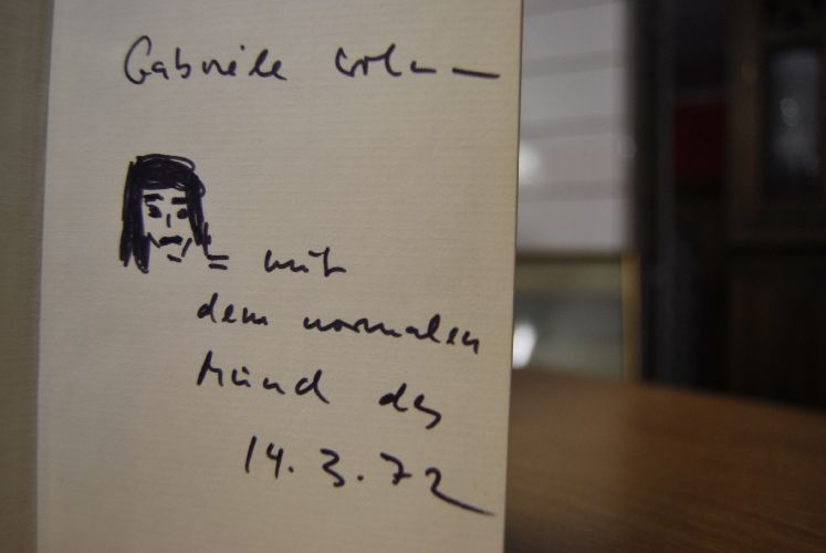 Beschreibung Schutzumschlag berieben, am Rücken gebräunt und auf der Rückseite mit sich lösender Laminierung. Papierbedingt gebräunt. Auf Vorsatz handschriftliche, datierte Widmung der Verfasserin mit einem skizzierten Selbstporträt. WG II Nr. 20.