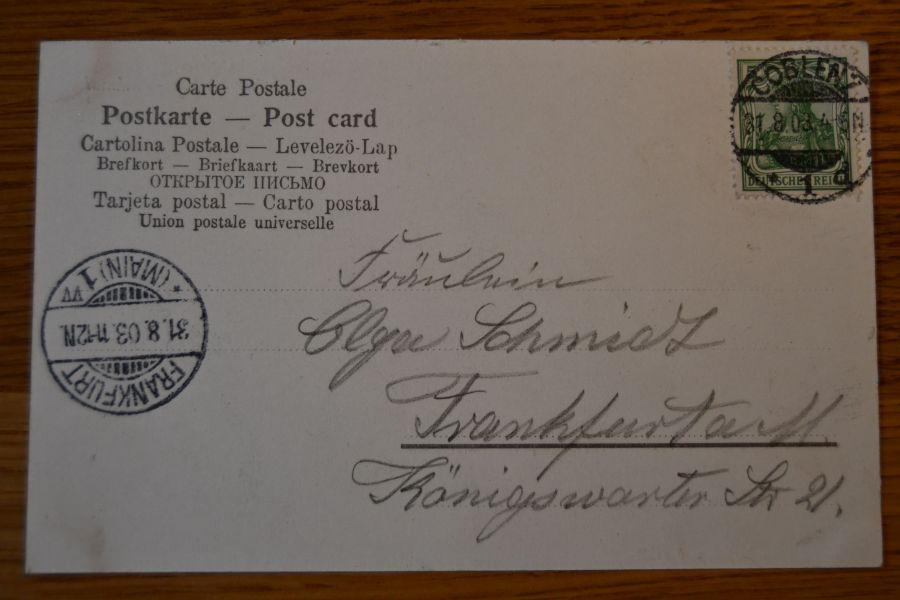Karte etwas angeschmutzt. Abgangsstempel Coblenz 31.8.1903. Ankunftsstempel Frankfurt/Main 31.8.1903.