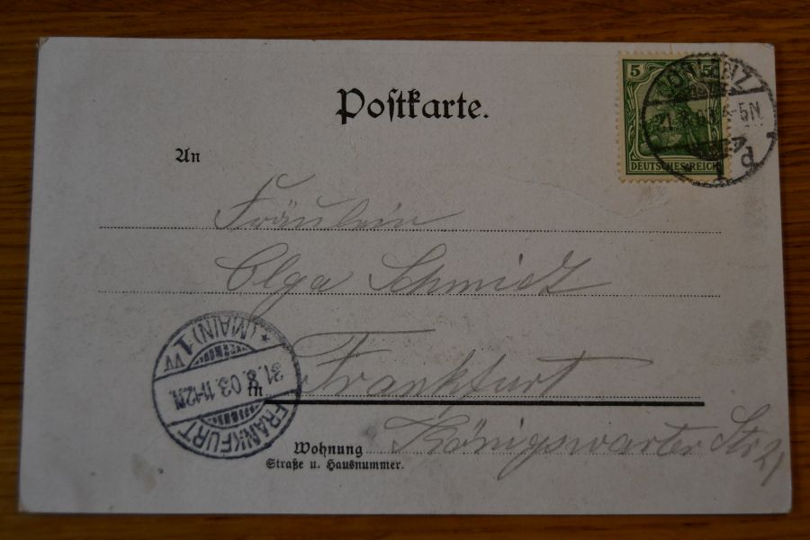Beschreibung Karte an den Ecken etwas bestoßen und mit Spuren eines Einsteckalbums. Abgangsstempel Coblenz 31.8.1903. Ankunftsstempel 31.8.1903.