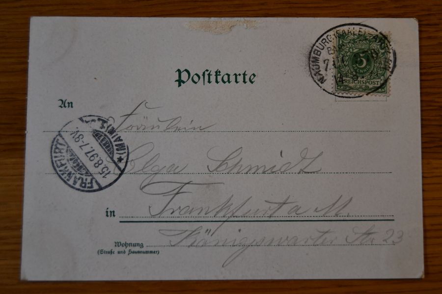 Beschreibung Karte mit Spuren eines Einsteckalbums an den Ecken. Karte gelaufen. Aufgabestempel Bahnpost Naumburg (Saale) - Artern Zug 370 14.8.1897. Ankunftsstempel Frankfurt/Main 15.8.1897.