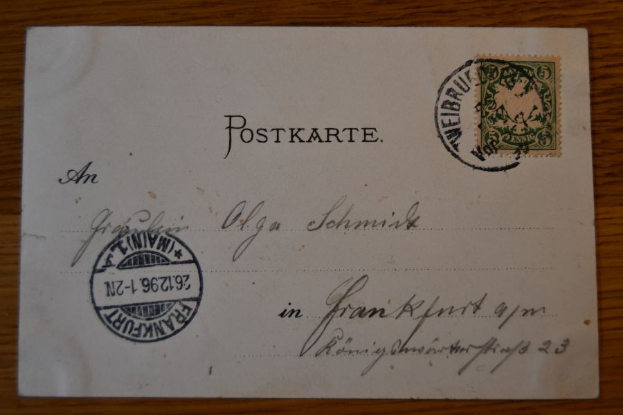 Beschreibung Karte an den Ecken bestoßen und mit Spuren eines Einsteckalbums.Abgangsstempel Zweibrücken 26.12.1896. Ankunftsstempel Frankfurt/Main 26.12.1896.