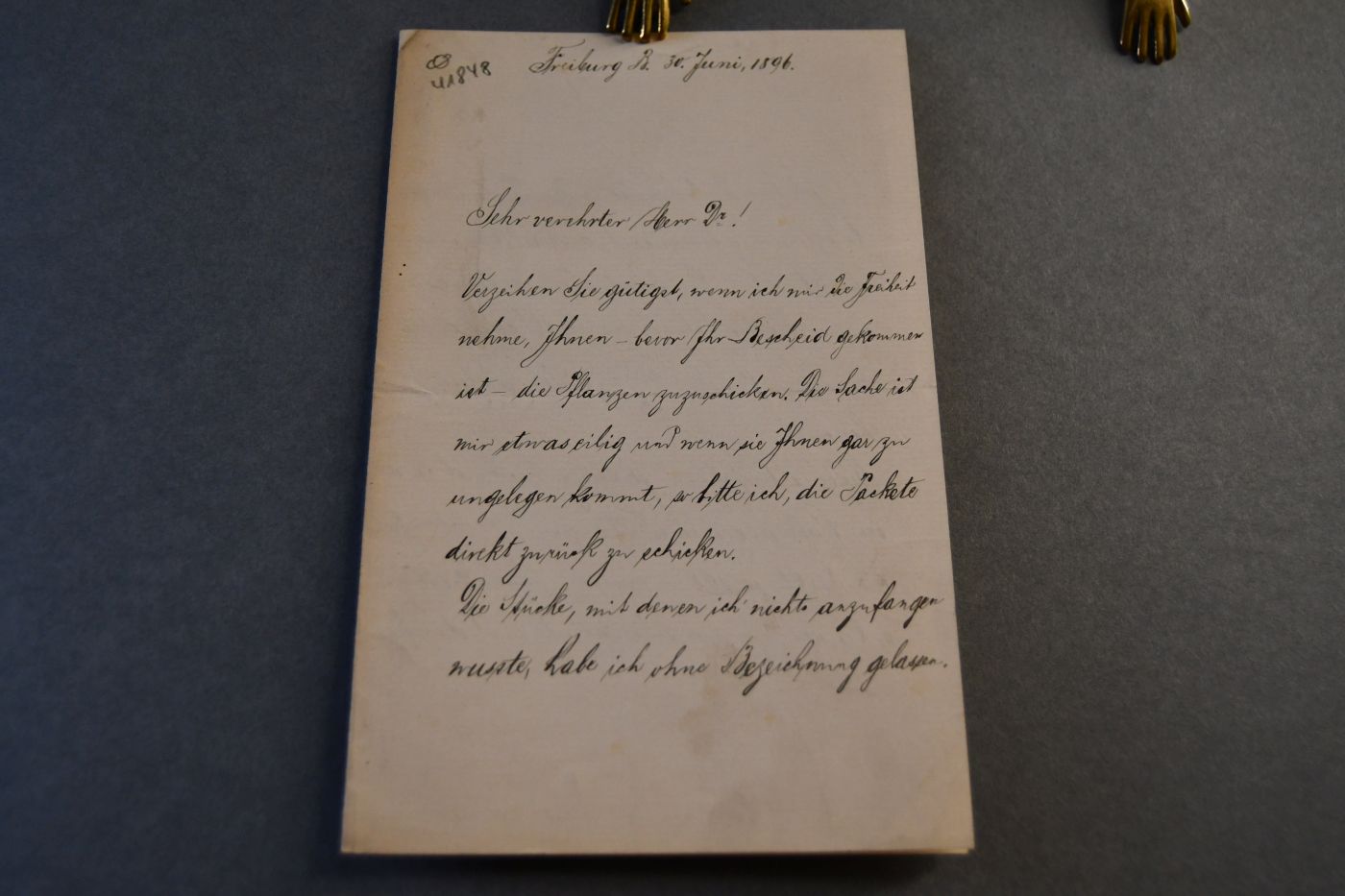 Beschreibung Durchgehender Querfalz. 3-seitiges handschriftliches Schreiben vom 30.6.1896. Boehm schickt Pakete mit Pflanzen da ihm die Sache eilt und er die Zusage nicht abwarten wolle. Ggf. solle man ihm die Pakete zurücksenden..
