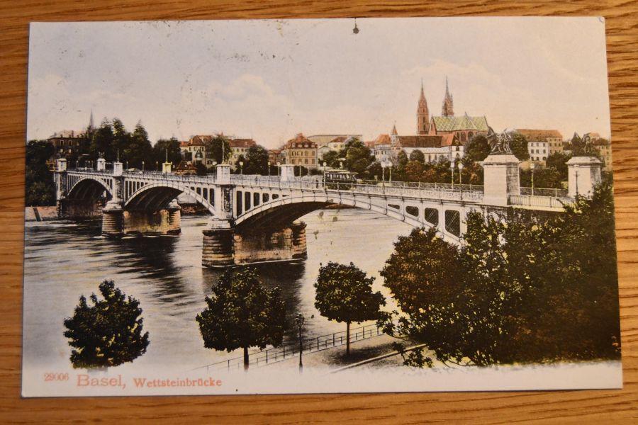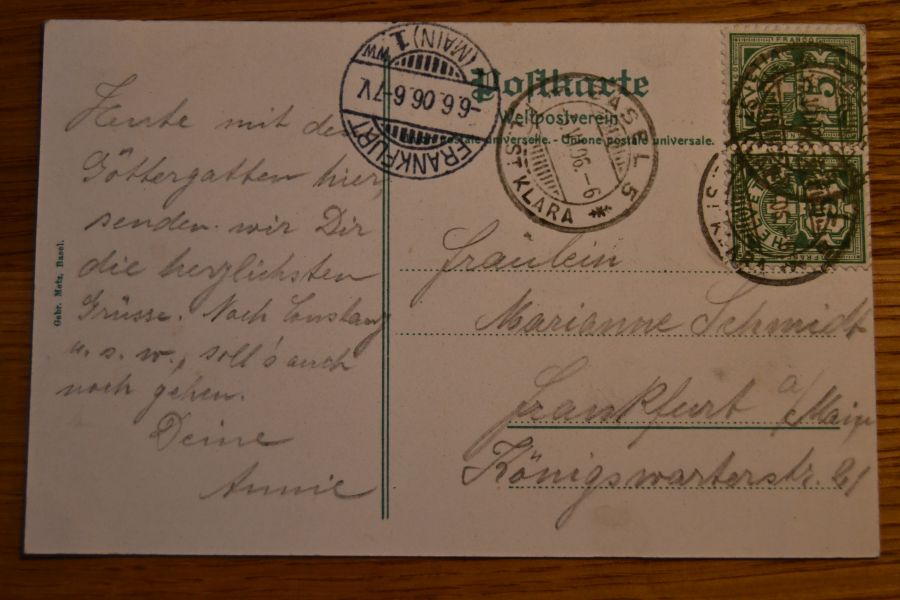 Beschreibung Karte mit Spuren eines Einsteckalbums an den Ecken. Karte gelaufen. Aufgabestempel Basel St. Klara 5.6.1906. Ankunftsstempel Frankfurt/Main 6.6.1906.