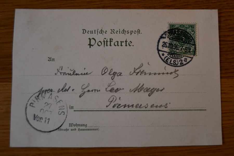 Beschreibung Karte unten und am rechten Rand beschnitten. Abgangsstempel Strassburg 26.10.1896. Ankunftsstempel Pirmasens 27.10.1896.