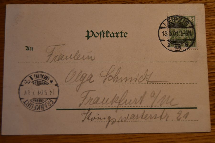 Beschreibung Karte mit Spuren eines Einsteckalbums an den Ecken. Karte gelaufen. Abgangsstempel Leipzig 13.5.1901. Ankunftsstempel 14.5.1901 Frankfurt/Main.