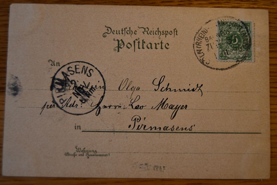 Beschreibung Karte an den Ecken bestoßen und mit Spuren eines Einsteckalbums. Abgangsstempel: Bahnpost Cöln-Frankfurt Zug 57, 1.11.1896; Ankunftsstempel: Pirmasens 2.11.1896.