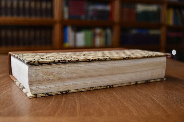 Format 25 x 15 cm, späteres Halbleder mit eingebundenen Broschurdeckeln
