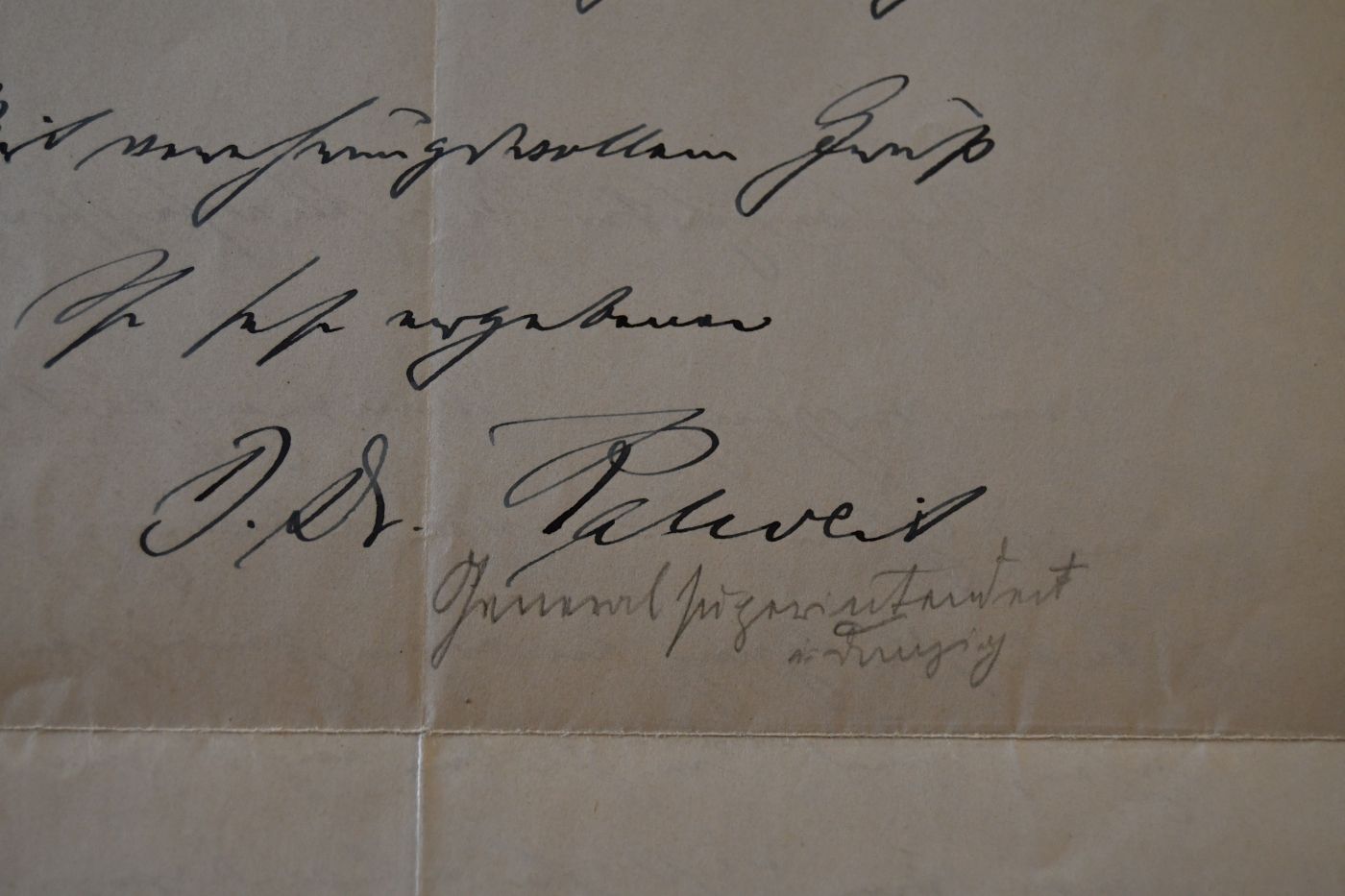 Beschreibung Durchgehender Längs- und Querfalz. 1 1/2-seitiger handschriftlicher Brief von Paul Kalweit in dem er um Unterstützung für einen gewissen Rexin bittet, den er und seine Frau in der Vergangenheit unterstützt hätten.