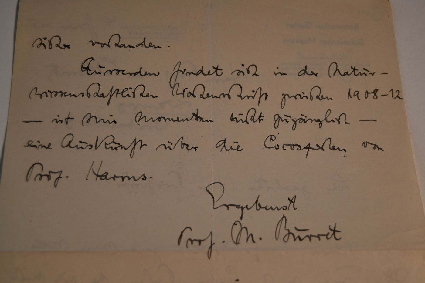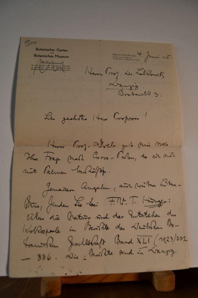 Beschreibung Zweiseitiges handschriftliches Schreiben vom 4.6.1935 mit dem gedruckten Briefkopf des Botanischen Gartens und Botanischen Museums. Max Burret gibt Literaturhinweise bezüglich einer Frage zu Cocos-Perlen.