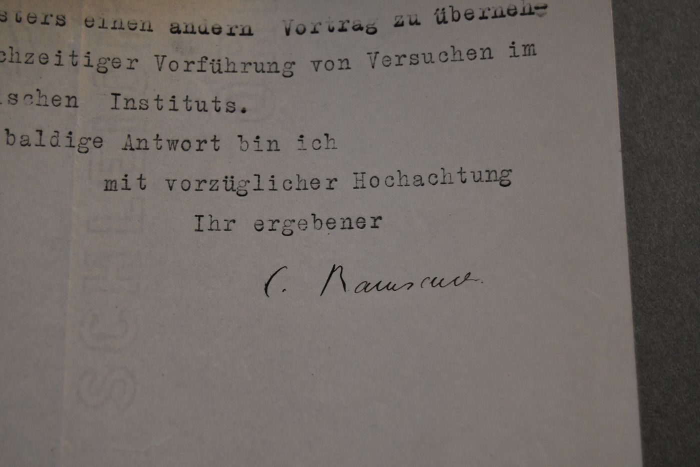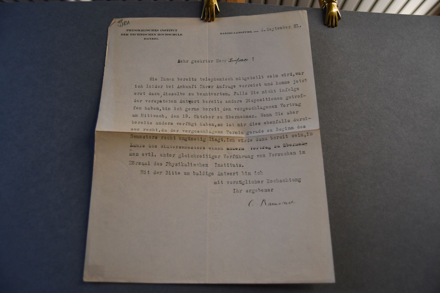 Beschreibung Durchgehender Längs- und Querfalz. Eselsohrig und gebräunt. Aufgedruckter Briefkopf des Physikalischen Instituts der Technischen Hochschule Danzig. 1-seitiges maschinenschriftliches Schreiben vom 3.9.1921. Ramsauer bietet an einen vorgeschlagenen Vortrag zu halten.