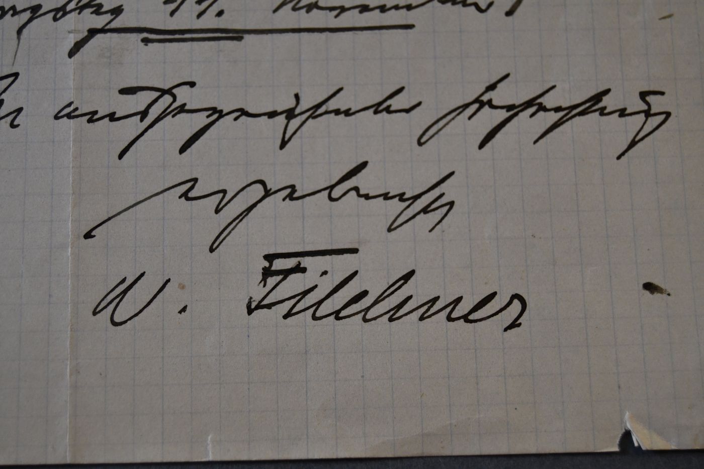 Beschreibung Durchgehender Quer- und Längsfalz sowie Einrisse. 1-seitiges handschriftliches Schreiben. Filchner sagt einen Vortrag zum Thema "Zum sechsten Erdteil" zu, den er am 11. November in Danzig halten will.