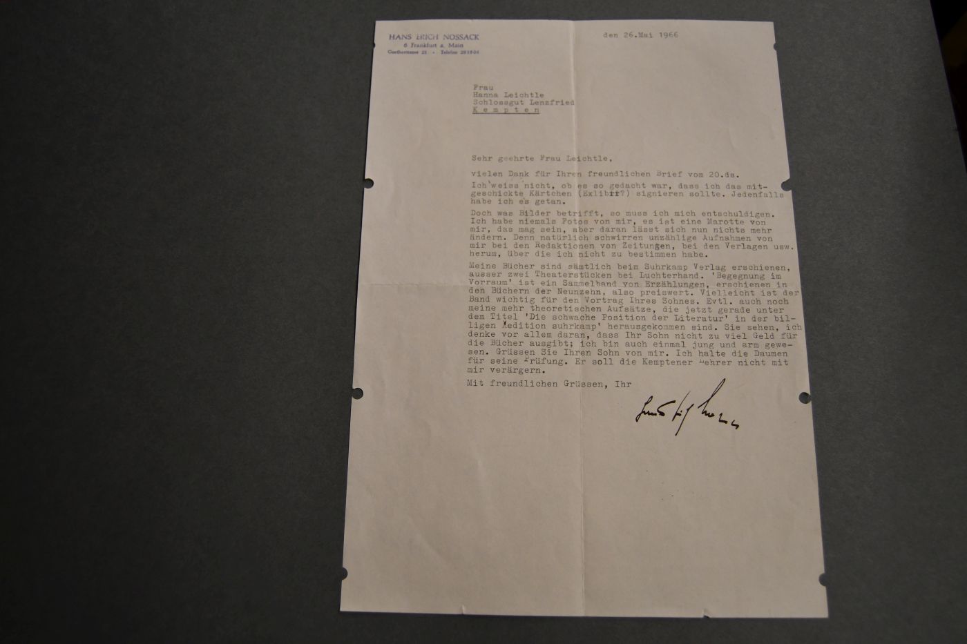 Maschinenschriftlicher Brief des Schriftstellers und Georg-Büchner-Preisträgers Hans Erich Nossack (1901-1977) an Hanna Leichtle auf dem Schlossgut Lenzfried bei Kempten vom 26. Mai 1966.