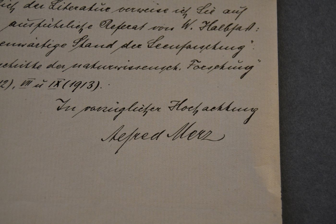 Beschreibung 1-seitiger handschriftlicher Brief. Durchgehender Längsfalz. Eselsohrig und mit Anschmutzungen am oberen Rand. Merz stellt fest, dass sich das Erscheinen der gemeinsamen Arbeiten durch den Krieg verzögert und verweist bezüglich der Literatur auf ein Referat von Halbfaß.